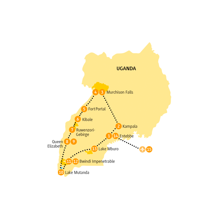 - Für die Schimpansen-Wanderung an Tag 6 sowie für die Gorilla-Wanderung an den Tagen 11 und 12 müssen im Vorfeld der Reise Permits gesichert werden. Bitte teile uns bereits bei der Buchung mit, an welchen Wanderungen du teilnehmen möchtest. Der Preis für diese optionalen Aktivitäten ist zusätzlich zur üblichen Anzahlung zu bezahlen und im Falle einer Stornierung nicht erstattungsfähig. Wir raten zum Abschluss einer Reiserücktrittsversicherung.