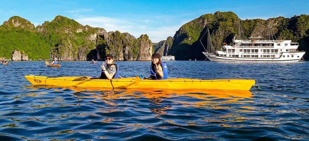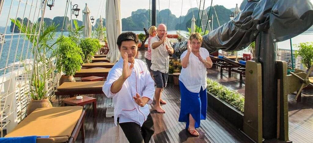 <Starte entspannt in den Tag oder etwas aktiver mit einer Tai Chi-Stunde auf dem Sonnendeck. Die Kampfkunst aus China wurde neben der Selbstverteidigung auch mit dem Ziel der Gesundheitserhaltung kreiert. Danach sollte auch die letzte Müdigkeit verflogen sein! Per Boot erreichst du später das Dorf Viet Hai auf der Insel Cat Ba. Die größte Insel in der Halong-Bucht ist ein einzigartiges Naturparadies, das du mit dem Fahrrad entdeckst. Du besuchst ein traditionelles Haus in einem Dorf tief im Nationalpark. Hier lernst du den Lebensstil der Einheimischen kennen. Weiter geht es zur Lan-Ha-Bucht, wo du im Ausflugsboot und bei leckerem Mittagessen die von vertikalen Felsen umsäumte Umgebung, erkundest. Vor dem Abendessen zeigt dir das Küchenoberhaupt noch wie traditionell vietnamesische Gerichte zubereitet werden. Lass es dir schmecken! Sollte dir die Fahrradtour zu anstrengend sein, stehen Elektroautos für dich zur Verfügung. -
