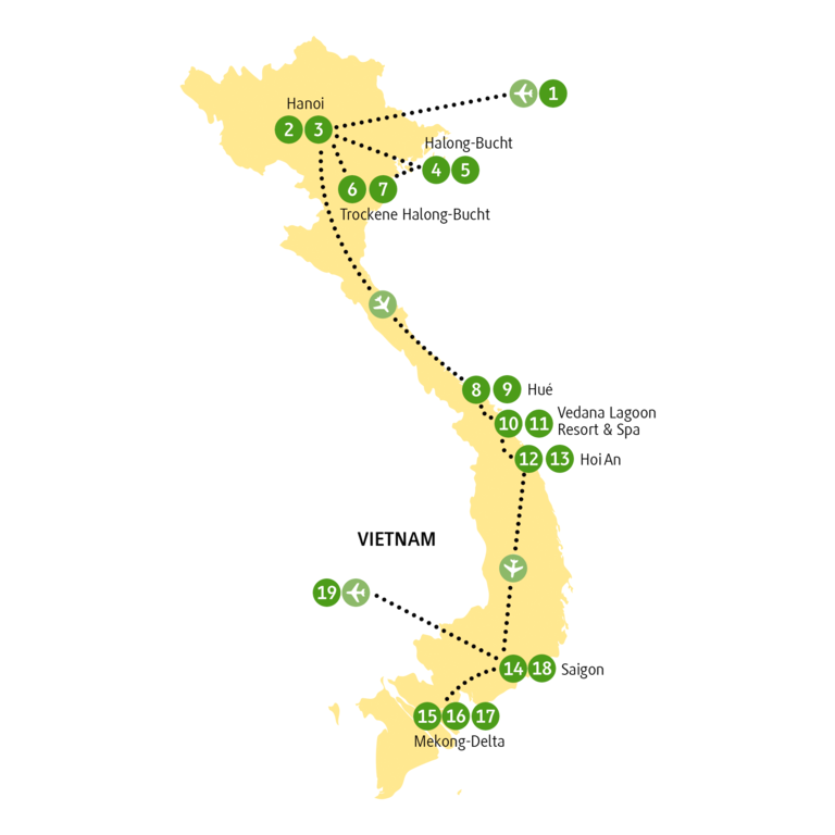 Schon die Namen könnten aus einem Märchenbuch stammen: Parfümfluss, Wolkenpass, Wasserpuppentheater, Dame des Himmels, die trockene Halong-Bucht, die gar nicht trocken ist und der See des zurückgegebenen Schwertes. Aber das ist alles Wirklichkeit, wie die zigtausend Lampions von Hoi An, der wilde Vespa-Ritt durch das nächtliche Saigon und die unfassbare Waterworld im Mekong-Delta. Und trotzdem wirst du nachher sagen, es sei märchenhaft schön gewesen.