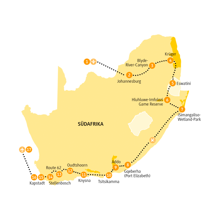 Auf das gewaltige Naturdrama Blyde-River-Canyon folgt das emotionale Beben: Big Five im Krüger-Nationalpark. Da verschafft uns König Misuzulu Zulu kaZwelithini im Zululand eine Atempause, bevor die 1.600 Breitmaulnashörner im Hluhluwe-Imfolozi Game Reserve kommen. Die Elefanten im Addo-Nationalpark warten auch schon. Oudtshoorn noch und Knysna auf der Garden Route, dann führt uns die berühmte Route 62 in die Wineyards von Stellenbosch und Kapstadt in den erlebten Wahnsinn.