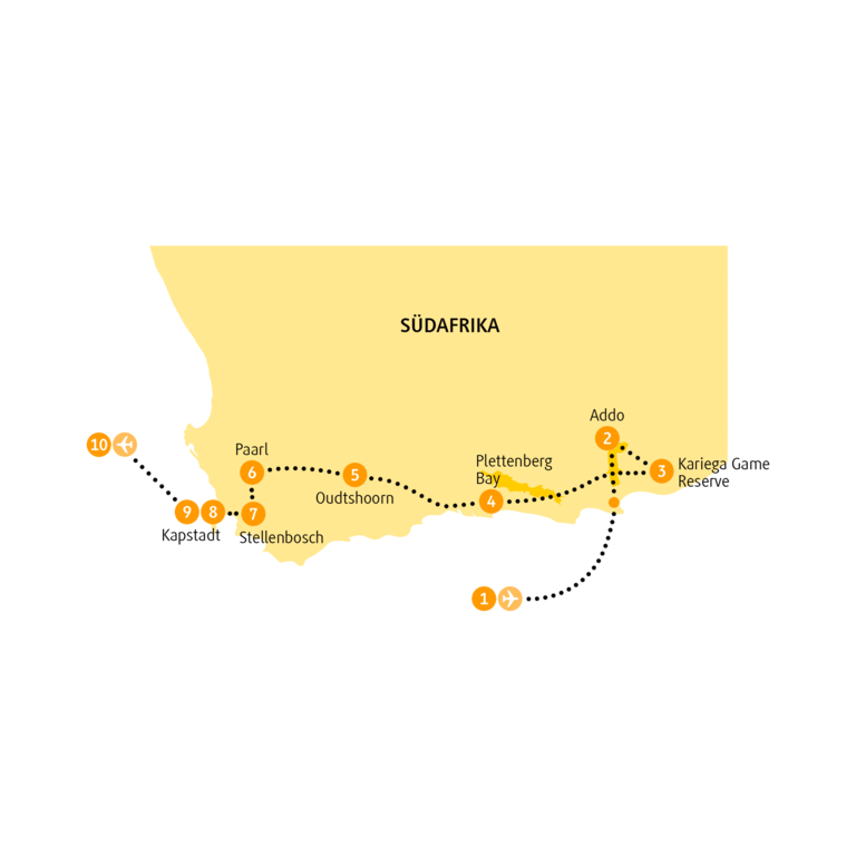 <Gleich morgens kletterst du wieder in den Jeep auf der Suche nach den Wildtieren im Busch. Vielleicht spürst du sogar einen Löwen auf, der die ersten Sonnenstrahlen des Tages genießt. Sicherlich gelingen dir mit deiner Kamera noch einige schöne Aufnahmen, bevor nach der zwei- bis dreistündigen Pirsch der Abschied von den Tieren naht. Weiter geht die Fahrt an der Küste zur berühmten Garden Route, einem der schönsten Küstenabschnitte Südafrikas, der sich von Mossel Bay bis zur Mündung des Storms River in den Ozean im Tsitsikamma-Nationalpark erstreckt. Der Tsitsikamma-Nationalpark ist einer der letzten noch nahezu unberührten Urwälder Südafrikas mit großen Beständen an Gelbholzbäumen, riesigen Farnen und seltenen Orchideen. Am Storms River Mouth wanderst du eine gute Stunde entlang der grandiosen Steilküste des Nationalparks und hast einen fantastischen Blick in die Schlucht. Am späten Nachmittag begrüßt dich Plettenberg Bay mit seinen schönen Sandstränden. -