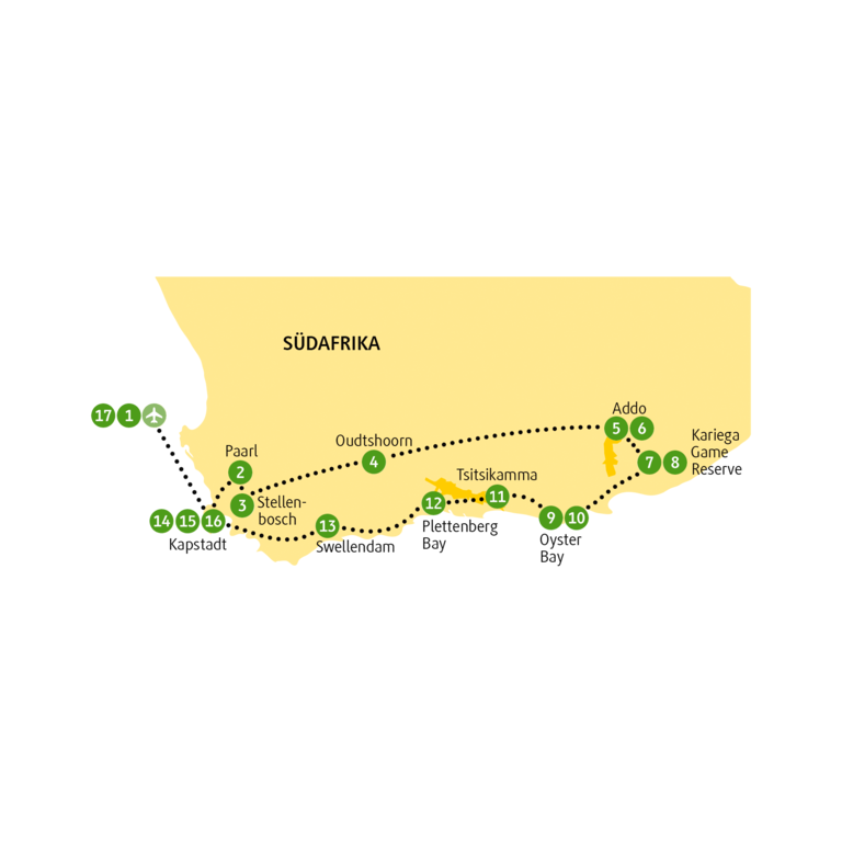 Genau genommen müsste es Big Fifteen heißen, denn zu den fünf Stars der Tierwelt kommen die seligen Weinlagen von Paarl, die berühmte Route 62, die schönste Stadt in der schönen Karoo, das Straußeneldorado Oudtshoorn, der Addo- Elephant-Nationalpark, die Safari-Abenteuer im Kariega Game Reserve, die äußerst schmackhafte Oyster Bay, der Wunderwelten-Nationalpark Tsitsikamma, das Badewasser der Plettenberg Bay und viiiiiiel Zeit für die Lebenslust von Kapstadt noch hinzu.