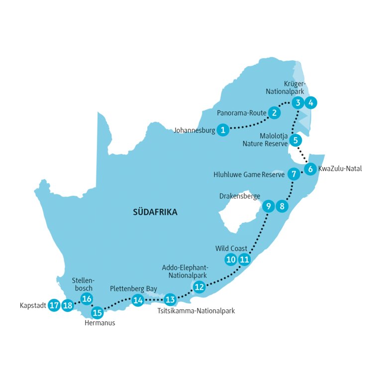 Mit den Big Five ist das so eine Sache. Sie sind da, aber launisch, wenn es darum geht, sich im richtigen Moment zu zeigen. Aber die übrigen Wunder der Natur – die Panorama Route, die Garden Route, die plakativen Kliffe, die Bilderbuch-Strände und das urgewaltige Kap – sie alle sind verlässlich zur Stelle. Im Rahmenprogramm: Tonnenweise Gänsehaut.