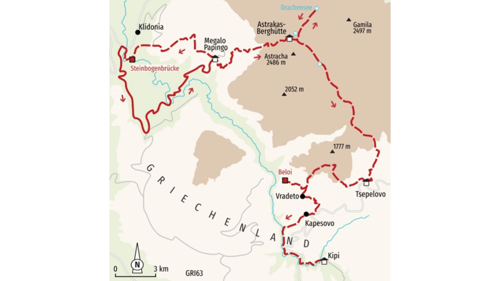 Trekkingreise in der abgelegenen Zagori Region von Papingo bis KipiIm Norden Griechenlands, fernab der Touristenpfade, liegt eine Landschaft wie aus einem anderen Jahrhundert: die Zagori-Region – zerklüftet, grün, wild. Zwischen uralten Steinbrücken, dichten Wäldern und schroffen Berggipfeln beginnt Ihre Trekkingreise. Von Papingo aus folgen Sie alten Pfaden durch dichte Wälder und überqueren die historischen Brücken von Klidonia sowie den türkisblauen Voidomatis-Fluss. Mit jedem Schritt gewinnen Sie an Höhe – über blühende Bergwiesen und karge Hänge steigen Sie hinauf zum sagenumwobenen Drachensee (Drakolimni). Hoch über der Baumgrenze gelegen, spiegelt sich in seinem klaren Wasser die raue Schönheit des Pindos-Gebirges – ein Ort von stiller Magie, umgeben von Felsen, Wind und Weite. Nach dem Abstieg vom See erwartet Sie die gemütliche Astrakas-Berghütte, spektakulär zwischen steilen Kalksteinwänden gelegen auf rund 1.950 Metern Höhe. Am folgenden Tag überqueren Sie die Astrakas-Hochebene, deren Weite und Abgeschiedenheit mit atemberaubenden Ausblicken belohnt wird, bevor Sie vom Beloi-Aussichtspunkt aus in die Tiefen der Vikos-Schlucht blicken – eine der tiefsten Schluchten der Welt. Ihre Reise endet im malerischen Dorf Kipi, wo steinerne Bögen, Eselspfade und stille Abgeschiedenheit das Bild bestimmen.Ein Trekking voller wilder Schönheit, eindrucksvoller Natur und kraftvoller Stille. Schritt für Schritt entdecken Sie das verborgene Griechenland – rau, ursprünglich und unvergesslich.