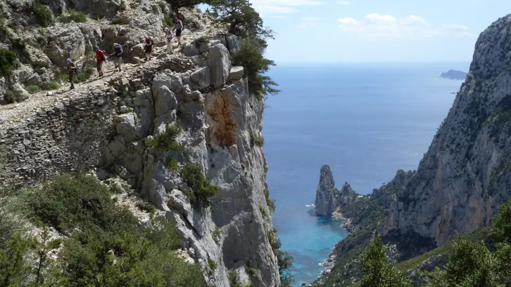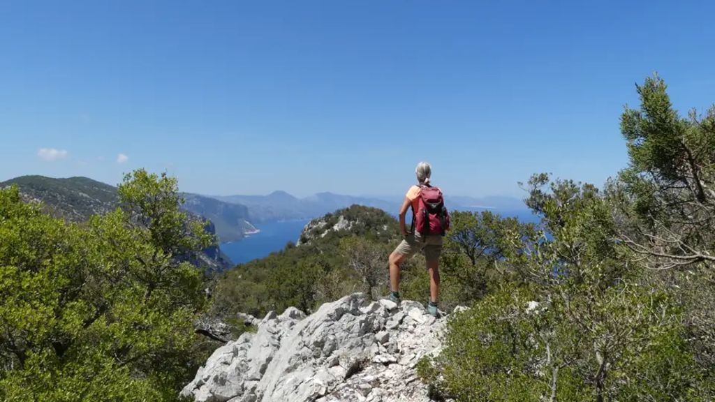 <Heute starten wir direkt vom Hotel. Oberhalb des Golf von Orosei wandern wir auf schmalen Pfaden, entlang eines Bergrückens hinauf bis zur Hirtenhütte von Sa Tintura und weiter zur Bucht Cala Cartoe. Wie wäre es mit einem Sprung ins Wasser? Nach einer ausgiebigen Pause kehren wir auf einem etwas tiefer gelegenen Pfad zurück zu unserem Hotel. -