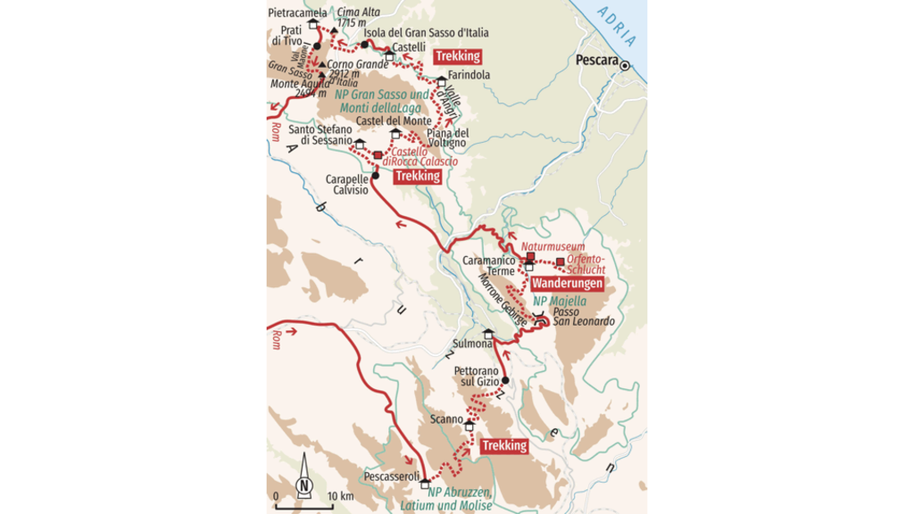 Trekkingreise in Zentral-Italien vom Nationalpark Abruzzen bis zum Nationalpark Gran SassoSteil ragen die imposanten Felswände in der Ferne empor. Im glänzenden See spiegelt sich der strahlend blaue Himmel wider. Über der Schlucht ziehen Mäusebussarde und Steinadler ihre Kreise und das Echo ihrer Schreie erfüllt die Stille um uns. Szenenwechsel: Auf den grünen Wiesen der Hochebene blühen Orchideen. Wildpferde galoppieren vorbei, sie stören sich nicht an den seltenen Besuchern zwischen Appenin und Adria. Der Klang ihrer Hufe verschwindet langsam in der Ferne und lässt uns nachdenklich zurück. Kaum eine halbe Stunde von den Badestränden entfernt schlummert die Bergwelt der Abruzzen in einem gemütlichen Takt. Alles ist langsamer, natürlicher und ursprünglicher – Menschen, Flora und Fauna. Wir durchqueren abseits der ausgetretenen Wanderpfade die gewaltige Naturkulisse Zentralitaliens, passieren schroffe Gipfelketten, wandern durch Täler und Schluchten und machen Halt in traditionellen Dörfern. Mit etwas Glück treffen wir auf unseren Wegen einige Bewohner der Region – Fischotter tummeln sich in den Gebirgsflüssen und Gämsen fühlen sich in der bergigen Landschaft besonders wohl. Beim Genuss des edlen Montepulciano d’Abruzzo kommen wir schnell mit den Einheimischen ins Gespräch, die gerne aus ihrem Leben erzählen – lautstark oder mit den Händen. Und mit den Füßen bewegen wir uns durch die steinige Orfento-Schlucht, wandern am Fuße des mächtigen Gran Sasso und erkunden das imposante Morrone-Gebirge. Die Sonne im Gesicht und schneebedeckte Gipfel vor Augen - Das Herz Italiens schlägt etwas langsamer, aber dafür intensiv.