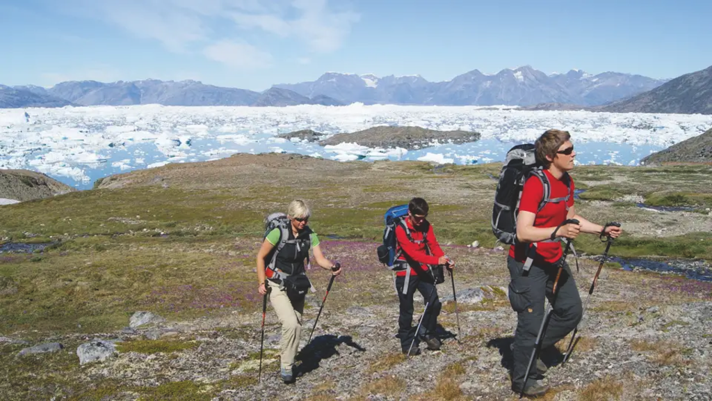 <Vor uns liegt der Hausberg von Tasiilaq - und wir wollen hinauf. Nachdem wir die Siedlung hinter uns gelassen haben, wandern wir an eisigen Gebirgsbächen und grünen Wiesen vorbei durch das Blumental. Die liebliche Landschaft wird aber schnell rauer und erst ein teilweise recht steiler Anstieg über wegloses Blockgelände führt uns zum Gipfel des Qaqertivagajik. Was für ein Schauspiel - unter uns treibt der größte Eisstrom der Erde gigantische Eisberge durch das Wasser. Die bizarren Formen lassen unserer Fantasie freien Lauf, bei gutem Wetter sehen wir die Eisschollen bis zu 150 km weit in der Sonne blitzen. Es lohnt sich aber auch, einen Blick nach Norden zu werfen. Tasiilaq schlummert wie eine bunt gewürfelte "Spielzeugwelt" am blauen Fjord. Und im Westen? Ganz in der Ferne entdecken wir das Inlandeis zwischen den gezackten Bergkuppen. Wir lassen die Eindrücke in Ruhe auf uns wirken, bevor wir zurück wandern. -