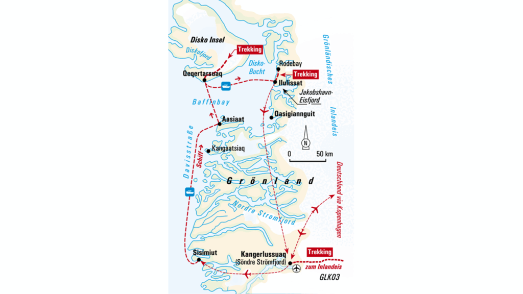 - Schiffspassagen ab Sisimiut via Aasiaat bis Qeqertarsuaq/ab Qeqertarsuaq bis Ilulissat