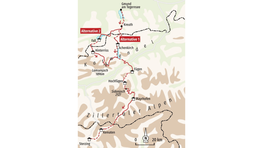 Wir stehen auf dem Pfitscher Joch, dem höchsten Punkt unserer Alpenüberquerung. Hier oben auf 2.246m pfeift der Wind frisch, doch die Erhabenheit der Zillertaler Alpen umgibt uns mit einer stillen Majestät. Hinter uns liegt die lange Wanderung durch die bayerischen Voralpen und den Naturpark Karwendel, vorbei an mächtigen Ahornbäumen oder türkisfarbenem Achensee. Jetzt, am Joch, öffnet sich vor uns der Blick auf das unberührte Pfitschtal und die markanten Gipfel der Zillertaler Alpen.In diesem Moment spüren wir die Weite der Alpen, die uns über mehrere Tage hinweg gefordert und verzaubert hat. Die frische Höhenluft füllt unsere Lungen, während wir die letzten Meter auf österreichischem Boden zurücklegen. Der Übergang von Österreich nach Italien fühlt sich dann beinahe wie ein Triumph an, als wir uns das Panorama der Südtiroler Berge zu eigen machen. Es ist der Höhepunkt dieser Reise, der Moment, an dem wir die Alpen wirklich überwinden – mit eigener Kraft, Schritt für Schritt.Mit einem letzten Blick auf die atemberaubende Landschaft brechen wir zu unserem Abstieg ins Pfitschtal auf, der uns schließlich ins historische Sterzing führt. Der Duft der regionalen Spezialitäten aus den vielen verschiedenen Restaurants begleitet uns auf dem letzten Stück dieser unvergesslichen Alpenüberquerung.