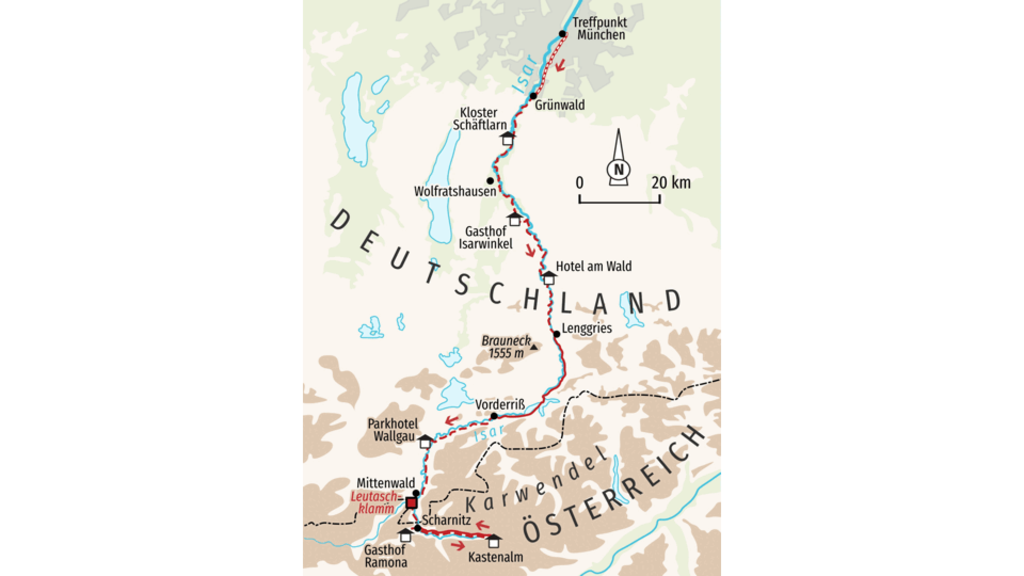 Trekkingreise entlang der Isar von München nach ScharnitzDie Isar, Bayerns längster und schönster Wildfluss, ist der Rote Faden für eine Kultur- und Naturwanderwoche von München bis zur Quelle in Tirol. Auf dieser Tour, die die drei unterschiedlichen Naturräume Münchner Schotterebene, oberbayerisches Hügelland und das Hochgebirge des Karwendels umfasst, entdecken wir die Geschichte des Isartals, historische Wasserkarftwerke oder auch das Kloster Schäftlarn. Aber auch die Natur entlang der Isarufer ist es wert, entdeckt zu werden. Sie wandern durch große Naturschutzgebiete mit intakten Auwäldern, vorbei an Blumenwiesen, Brutinseln seltener Vögel und durch Flussabschnitte, die in ihrer Einsamkeit und Weite an Kanada erinnern. Kommen Sie mit und staunen Sie auf einem einwöchigen Fluss-Trekking, bei dem sich Geschichte mit dem einzigartigen Wildflusscharakter der Isar zu einem spannenden Wandererlebnis verbindet.