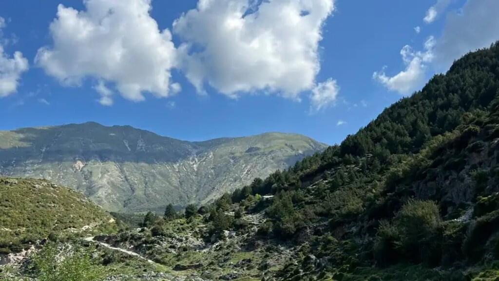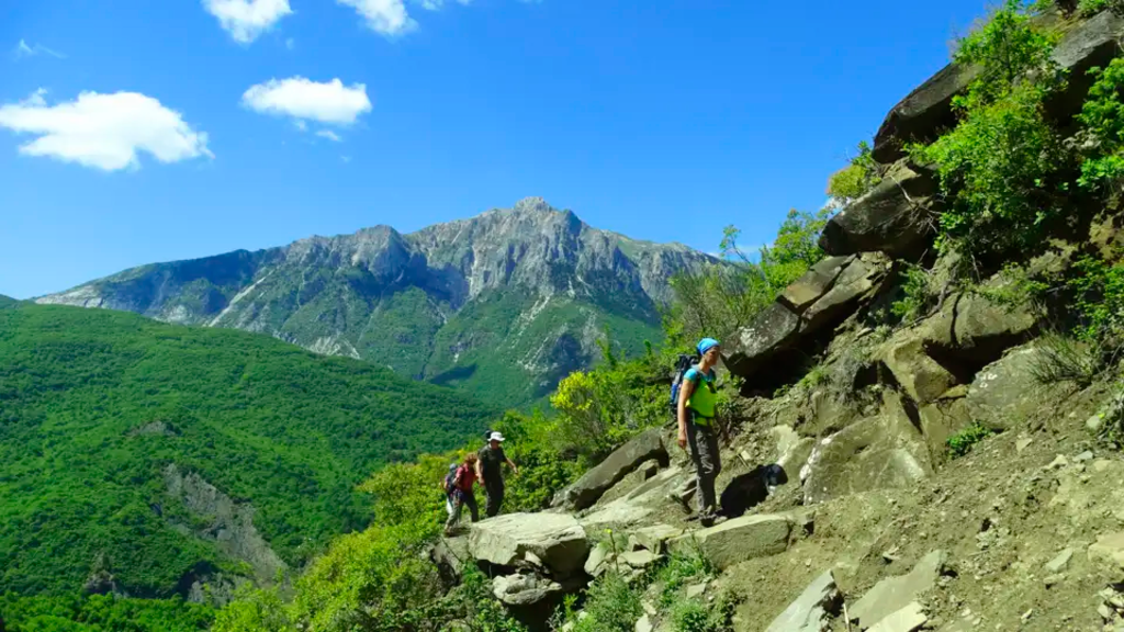 <Bei einer kurzen Fahrt entlang der Küste bieten sich uns wunderbare Aussichten auf die Karaburun-Halbinsel und die geschichtsträchtige Insel Sazan. Im Dorf Dukat, das in einem kleinen Seitental am Fuß des Llogara-Nationalparks liegt, starten wir zu unserer ersten Trekkingetappe. Wir folgen einer alten Karawanenroute, die früher den Römischen Hafen von Aulona (Vlora) und Orrikum mit den Kolonien im Binnenland verband. Heute wird dieser fast vergessene, wilde Weg nur noch von Ziegenherden und von uns Wanderern genutzt. Durch ein trockenes Flussbett, dann über Weideflächen und durch Tannenwälder wandern wir hinauf zum St. George-Pass (1.132 m). Hier werfen wir einen letzten Blick zurück aufs Meer und steigen dann auf gerölligen Eselspfaden hinunter ins Shushica-Tal. Durch einen uralten Eichenwald und vorbei am verlassenen Dorf Pirgu erreichen wir Terbac, wo wir heute bei einer albanischen Familie übernachten. Bevor uns unsere Gastgeber, eine Schäferfamilie, zu einem reichhaltigen Abendessen einladen, können wir uns die Überreste der Gebäude aus kommunistischer Zeit ansehen oder die Seele im Garten baumeln lassen. -