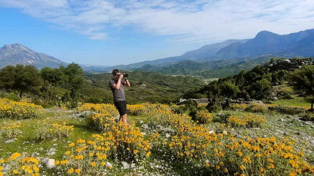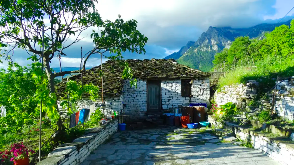 <Am Morgen überspringen wir ein kurzes Wegstück von 8 km nach Kallarat mit dem Fahrzeug. Von hier führt uns ein langer Aufstieg, teils im Schatten, teils über geröllige Pfade, hinauf zu einem abgeschiedenen Hochplateau auf dem Dach des Ceraunischen Küstengebirges. Während des Sommerhalbjahrs halten sich hier Hirten mit ihren Schafherden auf. Wir haben nun bald den höchsten Punkt unserer Wanderung, den "Balkon der Riviera" (1.400 m) erreicht. Atemberaubende Ausblicke auf die Küste, zu den Dörfern im Hochland und den oft schneebedeckten Gipfel des Nemercka (2.482 m) sind der Lohn für den schweißtreibenden Aufstieg. Entlang des Grates steigen wir mit schönem Ausblick ins Dorf Pilur ab. Dort übernachten wir im höchsten Dorf der Albanischen Riviera ein letztes Mal im Gästehaus einer Familie von Sängern und Poeten. -