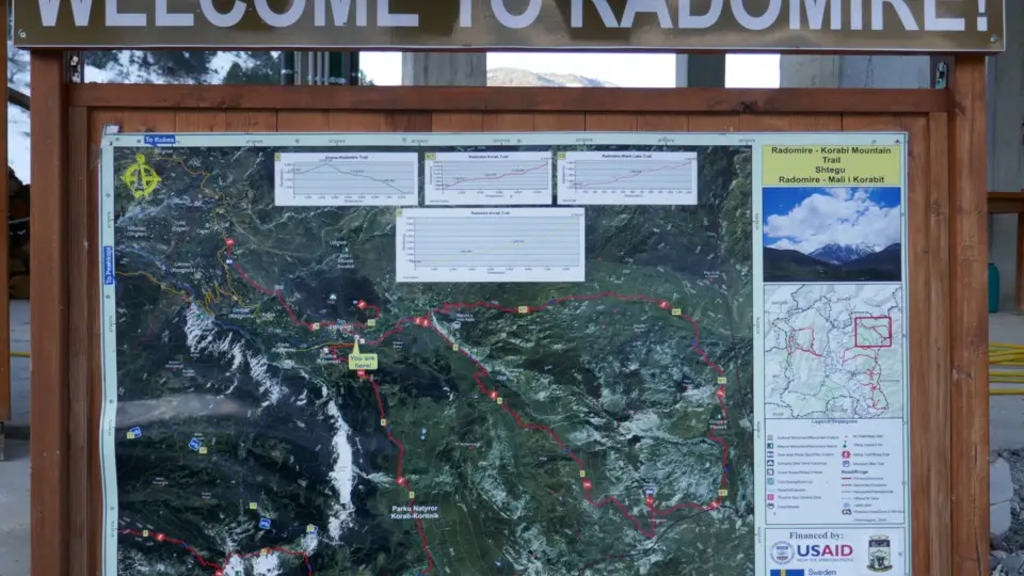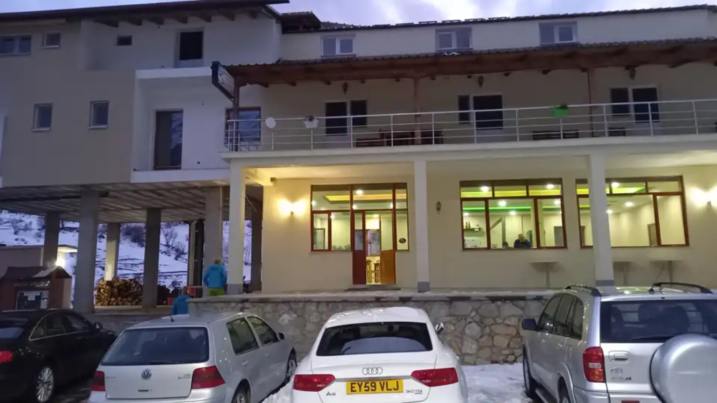 <Flug nach Pristina. Nach der Ankunft am Flughafen treffen wir uns um 12:00 Uhr mit unserem lokalen englischsprachigen Skiführer. Wir reisen einmal durch den Kosovo und überqueren die Grenze nach Albanien. Die Fahrt führt landschaftlich reizvoll durch die Gipfel des Korab-Koritnik Gebirges hindurch zum Dorf Radomire, wo wir übernachten. Beim Abendessen erfahren wir von unserem einheimischen Skiführer mehr über die Reise. -
