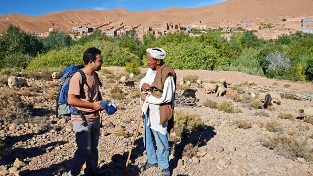 Gemütlich wandern wir hinab ins Ounila-Tal. Dann folgen wir dem Weg in ein Tal bis zum Dorf Tighza (1.800 m). Hier sind wir am Ziel unseres intensiven Trekkings durch den Hohen Atlas angelangt. Unser Trekkingkoch verköstigt uns zum letzten Mal und serviert ein Abschiedsessen. Unsere Begleitmannschaft mit den Mulis verabschiedet sich vielleicht schon heute Nachmittag und tritt ihren Rückweg nach Hause an. In Tighza schlafen wir in einem einfachen Gästehaus.