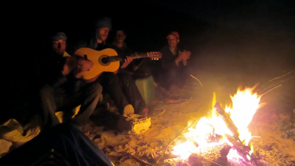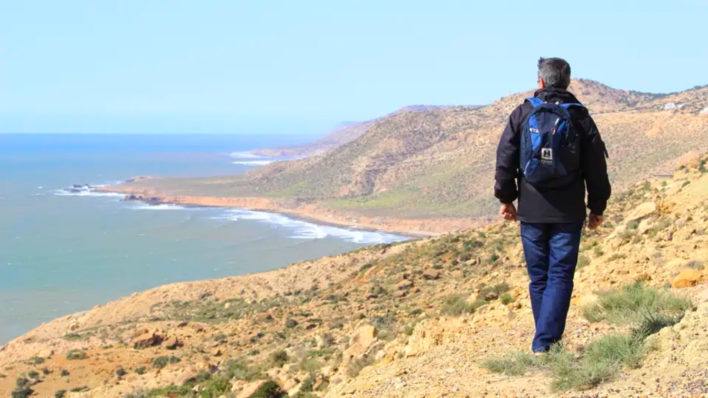 <Nach dem Frühstück fahren wir entlang der Atlantikküste nordwärts. An den Steilfelsen bei Cap Rhir und am Aussichtspunkt auf die Pointe Imessouane legen wir einen Stopp ein. Wir fahren ein Stück weiter nach Zaouit Louda wo wir unsere Begleitmannschaft mit ihren Lastenkamelen treffen. Sollten optional Reitkamele gebucht worden, findet nun eine kleine Einführung ins Kamelreiten statt, insbesondere zum Auf- und Absitzen sowie zum Aufstehen und Hinlegen der Kamele. Ein Treiber betreut und führt im Schnitt 2 bis 3 Tiere. In etwa zwei Stunden wandernd oder reitend, erreichen wir den kleinen Küstenort Timezguida n'Ouftas. Wir gelangen an eine schöne Bucht, wo wir unser erstes Zeltlager auf bauen. Der Rest des Tages dient zum Entspannen und Baden im Meer oder zum Erkunden der Umgebung der Bucht. -