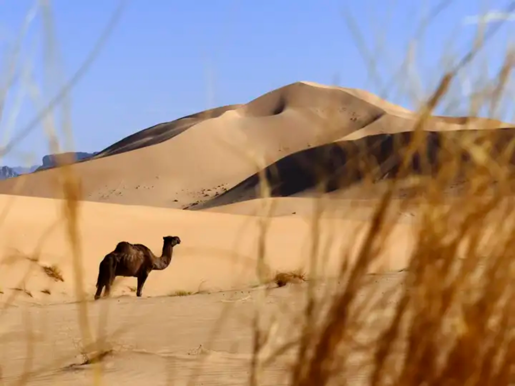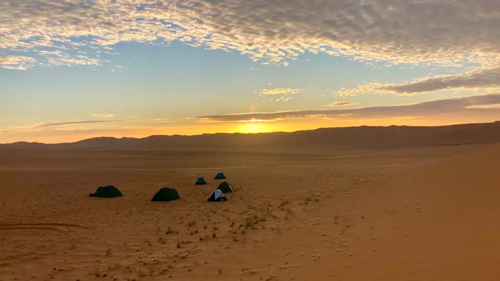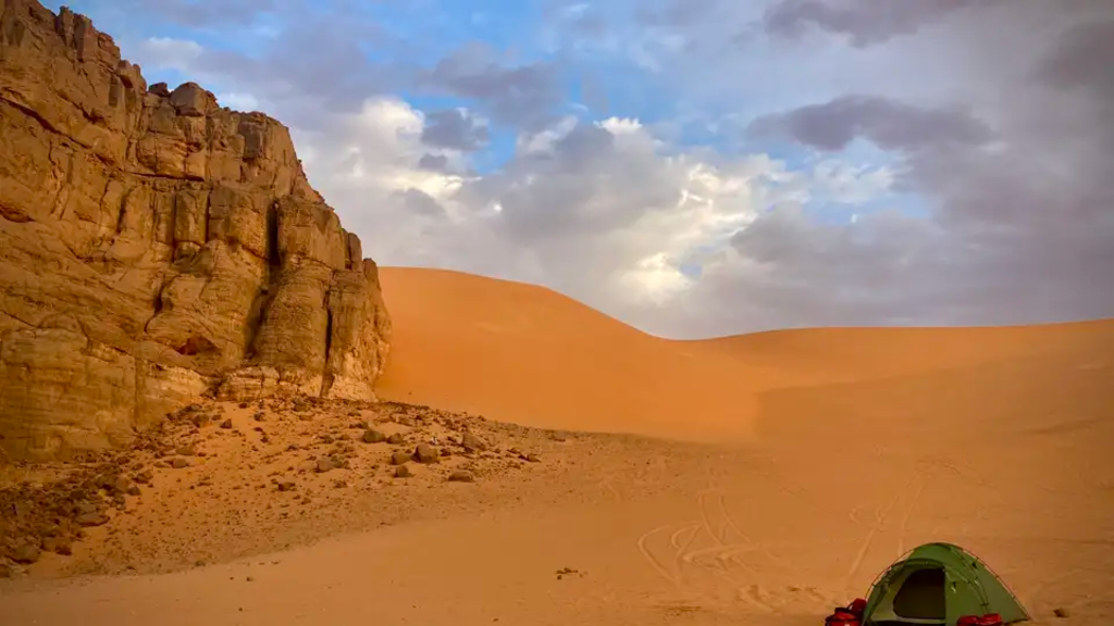<Heute fahren wir in die Schlucht von Essendilène und wandern in einen Canyon zu einer grün-schimmernden Guelta, die eingebettet zwischen üppigem Oleander und ausladenden Tamarisken liegt. Wieder zurück zum Ausgangspunkt wartet unser Koch bereits mit dem Mittagessen auf uns. Nach einer ausgiebigen Pause fahren wir in Richtung Erg Essendilène mit Stop an den Gravuren von Tinterghert. Sie gehören zu den berühmtesten Felsgravuren der Sahara – besonders die "Schlafende Gazelle" und "Lockige Kuh" machen Eindruck! Wir bauen unsere Zelte inmitten der Sanddünen auf und genießen den Sonnenuntergang. -