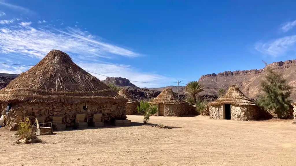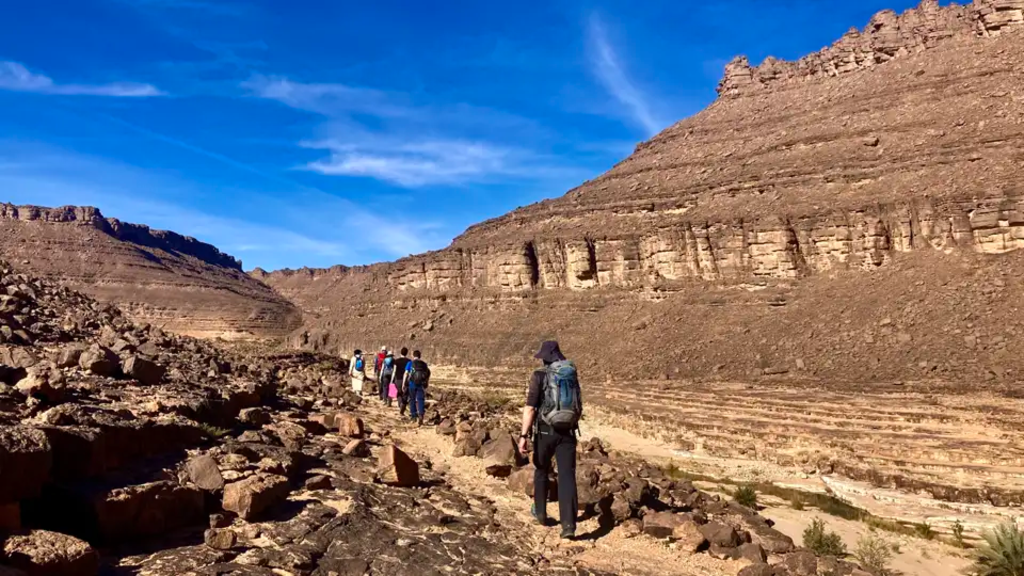 <Nach einem kurzen Transfer erreichen wir die Gueltas von Idaran. Die eindrucksvolle Landschaft ist geprägt von ihren natürlichen Wasserbecken, die in Schluchten oder hinter Felswänden verborgen liegen. Wir erkunden ein weit verzweigtes Netz von Wasserläufen, die der Fels über Jahrtausende geformt hat, streifen durch Schilfzonen und bewundern die bizarren Felsformationen. Ein heutzutage nur noch zu Erntezeiten von Nomaden genutztes Zeriba-Dorf vermittelt uns einen lebendigen Eindruck davon, wie das Leben an diesem ehemaligen Knotenpunkt der Karawanen einst ausgesehen haben könnte. -