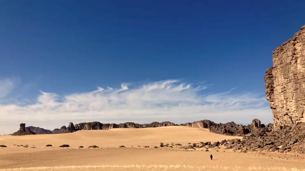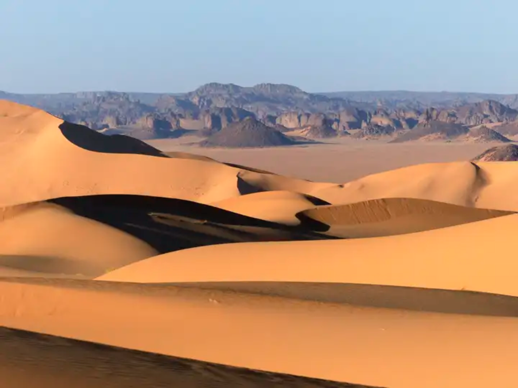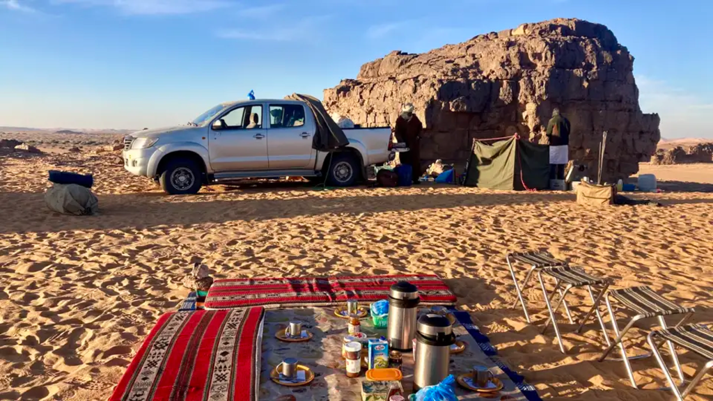 <Nach dem Frühstück fahren wir nach Djanet. Wir erledigen die nötigen Formalitäten bei der Nationalparkbehörde und haben etwas Zeit, über den kleinen Bazar zu schlendern. Wir verlassen die Stadt in Richtung Norden und fahren hinein in das Tassili n’Ajjer mit seinen endlos scheinenden Sanddünen. Mittags machen wir ein Picknick und erreichen am späten Nachmittag das Tuareg Dorf Iherir. Die folgenden zwei Nächte verbringen wir in einem Camp – entweder in Zeriba-Lehm-Hütten oder in unseren Zelten. Am Abend genießen wir in der Gemeinschaftshütte unser erstes gemeinsames Abendessen. -