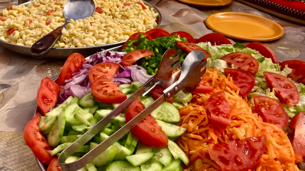 Der Koch bereitet mittags leichte, schmackhafte Salate (mit Reis, Hülsenfrüchten, Tomaten, Gurken, Oliven u. Ä.) zu, dazu wird oft Käse oder Thunfisch gereicht. Abends gibt es ein warmes Essen mit Suppe und als Hauptspeise Couscous, Kartoffeln, Reis oder ein Nudelgericht. Fleisch wird eher selten zubereitet. Gemüse ist fast immer enthalten. Unsere Tuareg-Köche geben sich große Mühe und zaubern unter einfachsten Umständen, im Rahmen des Möglichen, vielfältige, schmackhafte Gerichte.