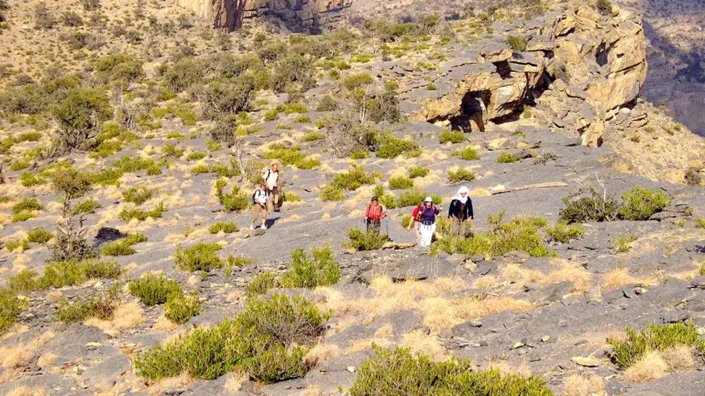 <Von unserer Unterkunft aus starten wir heute unsere Wanderung und erklimmen auf einem uralten steilen Pfad, teilweise über Natursteintreppen, eine Anhöhe und gelangen nach Shorfet Al Alamin. Auf einem kleinen Pass in etwa 2.000 Meter Höhe genießen wir während unseres Picknicks einen grandiosen Blick auf die unter uns liegende Oase und in die Täler. Weiter entlang der Bergflanke wandern wir mit eindrucksvollen Fernblicken zu beiden Seiten. Nach der Wanderung werden wir abgeholt und fahren etwa zwei Stunden nach Al Qiyut, wo wir unser Camp für die nächste Nacht aufschlagen. Unsere Begleitmannschaft bereitet ein schmackhaftes Abendmahl, während wir den Sonnenuntergang bestaunen. -