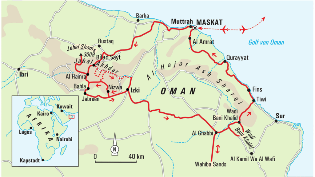 Wanderreise durch Wadis, die Gebirgszüge des Hadschar-Massivs sowie Besteigung des Jebel ShamsWir folgen schmalen Eselspfaden durch die zerklüftete Bergregion des Hadschar-Massivs. Immer wieder trotten langhaarige Bergziegen neben uns her. Unser Blick schweift in die unendliche Weite dieses arabischen Bergpanoramas mit seinen zahlreichen Gebirgsspitzen und markanten Felsen. Auf unserem Weg zu den Gipfeln dieser Region wandern wir durch grüne Täler und tiefe Schluchten zwischen steil aufragenden Felswänden. An einige Berghänge schmiegen sich malerisch kleine Dörfer. Hier bewegen wir uns auf kaum begangenen Wegen. In dieser vergleichsweise fruchtbaren Gegend entdecken wir grüne Oasen mit üppigen Obstgärten und wandern vorbei an groß angelegten Terrassenfeldern, auf denen Aprikosen, Pfirsiche, Mandeln und sogar süßlich duftende Rosen gedeihen. Die Pflanzen passen zu den angenehm mediterranen Temperaturen. Ein besonderer Höhepunkt ist die Besteigung des Jebel Shams, dem höchsten Berg im Oman. Die lange Wanderung wird mit spektakulären Aussichten belohnt. Unser anschließender Abstecher in die Wahiba Sands führt uns die Naturvielfalt des Landes vor Augen. Beim Erklimmen der weichen Sanddünen vermissen wir fast die steinigen Pfade der Gebirgswege. Im von Palmenhainen gesäumten Wadi Bani Khalid gibt es Stellen mit natürlichen Pools – diese durchschwimmen wir auf unserem Weg, eine willkommene Erfrischung! Von hier aus überschreiten wir das östliche Hadschar-Gebirge vom Wadi Bani Khalid ins Wadi Tiwi. Damit haben wir uns die Entspannung in unserem Strandhotel wirklich verdient, bevor wir uns in das lebhafte Getummel des orientalischen Souks von Muttrah stürzen. Vielleicht ein paar frische Datteln für zu Hause?