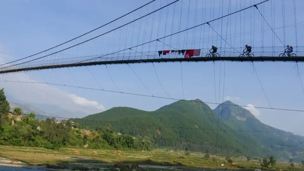 <Mit dem Bus gelangen wir über einen Pass zum Ausgangspunkt unserer Bikeroute nach Kakani. Unsere Himalaya-Panoramatour orientiert sich an einer alten Handelsroute. Den heutigen Tag prägen Eindrücke vom Nationalpark, ein langer Downhill und überwiegend Fahrten zwischen Flusslandschaften mit Überquerung einer abenteuerlichen, befahrbaren Brücke und Terrassenfeldern sowie Begegnungen mit den Einheimischen. Wir radeln über Thansing Phat nach Sera in Trisuli. -