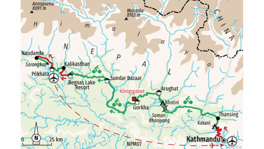 MTB Reise von Kathmandu über Königsstädte und Tempel nach PokharaDie eisbedeckten Bergriesen - die höchsten Gipfel der Welt - die Tempel, Königspaläste und nicht zuletzt die gastfreundlichen Menschen sind es, die Nepal so anziehend machen. Um die prachtvollen Gebirgslandschaften des kleinen Landes im Himalaya nicht nur Wanderern, sondern auch Bikern zu erschließen, bieten wir in Nepal eine Mountainbiketour an. Diese orientiert sich an einer alten, längst in Vergessenheit geratenen Handelsroute. Die Bike-Tour führt im Herzen des Himalaya über die alte Handelsroute von Kathmandu nach Pokhara an den Phewa-See. Seit die Überlandstraße gebaut wurde, werden die Bergpfade nur noch von Dorfbewohnern benutzt. Kennen lernen und genießen werden Sie die volle Bandbreite an Wegen. Sie biken zu 90 Prozent auf Karrenwegen, Sand-, Lehm- und Schotterpisten sowie auf vielen herrlichen Höhen-Trails. Von den Pässen und Bergkämmen, die auf der Route überwunden werden, bieten sich atemberaubende Ausblicke auf die Gipfel des Manaslu, des Lamjung-, Annapurna- und Langtang-Massivs bis zum Mount Everest. Unterwegs haben Sie immer wieder die Möglichkeit, in den Dörfern Kontakte zu knüpfen. Nicht selten werden Sie neugierige Blicke aus lachenden Kinderaugen erfreuen. Ein ortskundiger lokaler Mountainbike-Guide ist bei der Gruppe und vermittelt zwischen Bikern und Dorfbewohnern, so dass echte Begegnungen möglich sind. Großes Bike-Erlebnis mit tollem Himalaya-Panorama!Reisebericht