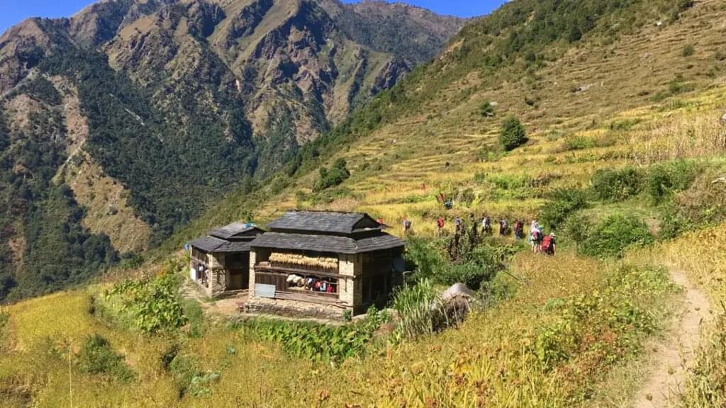 <Wir steigen langsam zum Bagar Khola hinab. Am gegenüberliegenden Hang sehen wir das Gurung-Dorf Chim Khola, das sich perfekt in die Umgebung anpasst. Vom Tal folgen wir einem breiten Weg nach Gyasi Kharka hinauf - Manapati und Dhaulagiri mit im Blick! Kaum oben, geht es wieder hinunter zum Raughat Khola, den wir über eine Brücke queren. Steile Steinstufen führen uns auf der gegenüberliegenden Flussseite nach Chaurkhani, ein Dorf das sowohl von Gurung als auch Magar bewohnt wird. Nach der Mittagspause wandern wir das letzte Stück bis zu unserem Lagerplatz auf der Alm Pahiro Kharka (2.150 m). -