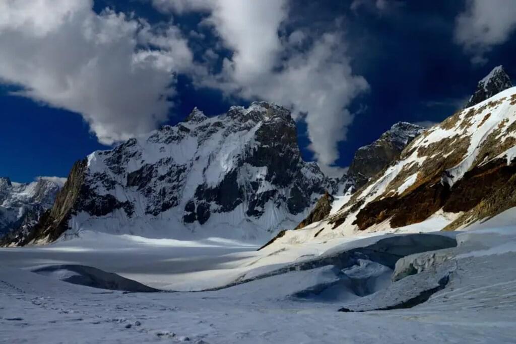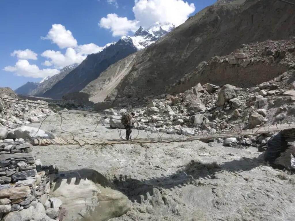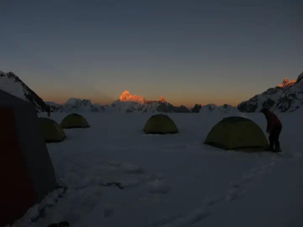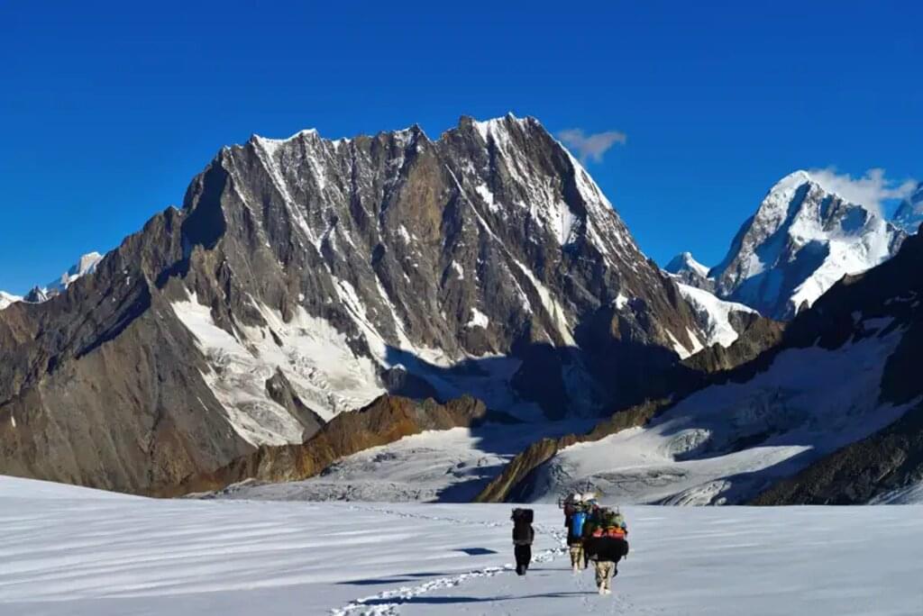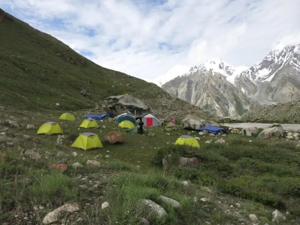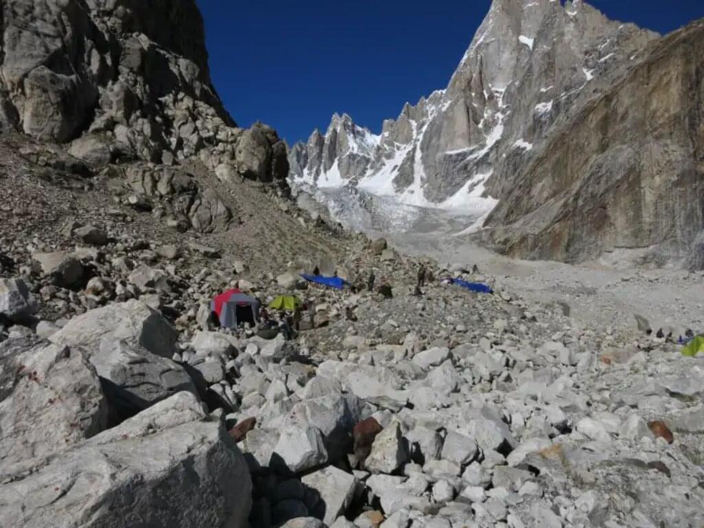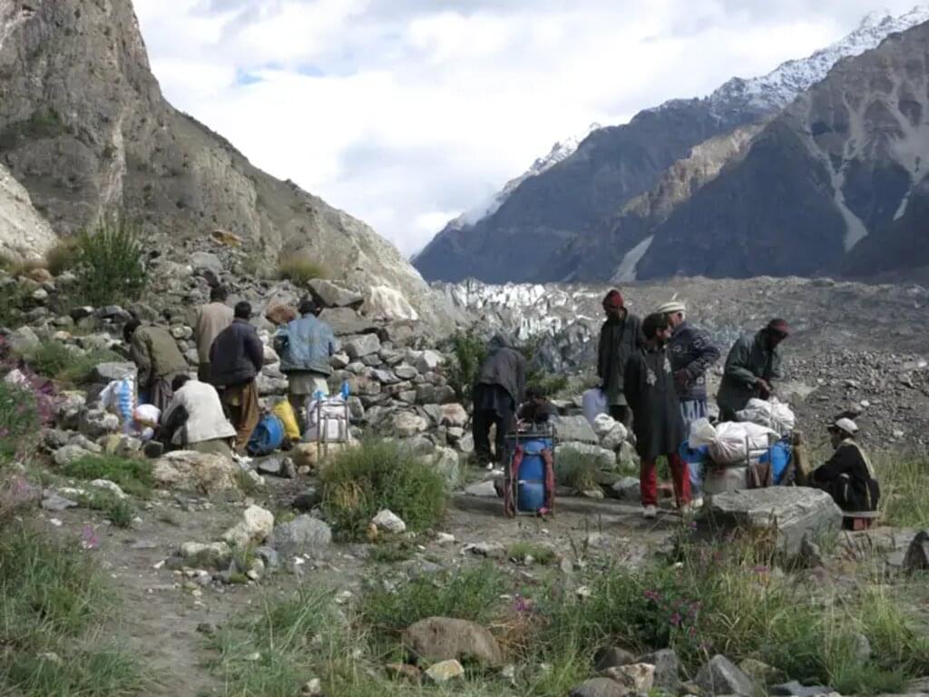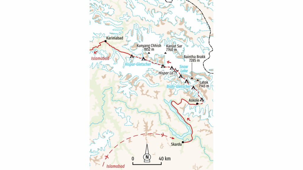 <Unser Trekking beginnt auf der Route, die auch zum K2-Basislager führt. Von Askole geht es zusammen mit unseren Trägern am Braldu-Fluß entlang, bevor wir nach Nordwesten zum Biafo-Gletscher abbiegen. Der Weg steigt über eine Schulter an, um die linke Moräne zu erreichen, und führt dann hinunter zum Gletscher und zu dessen linken Ufer, wo wir hinter einer Seitenmoräne das grasbewachsene Camp Namla in einer Höhe von ca. 3.650 m erreichen. -