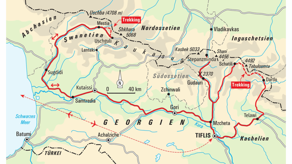 Trekkingreise in die Regionen Tuschetien und Swanetien sowie zum KasbekDie Nacht ist sternenklar. Der Mond strahlt hell auf die weißen Bergspitzen, in der Ferne blöken Schafe. Ein kurzes Hundegebell sorgt schnell wieder für Ruhe - kein Straßenlärm ist zu hören. Wir sind alleine in unserem Camp mitten im Großen Kaukasus, atmen die frische Luft auf rund 2200 Metern Höhe. Erst am Morgen erwacht die Natur wieder zum Leben und mit den wärmenden Sonnenstrahlen setzen wir unser Trekking durch die reizvolle Bergwelt fort. Wir wandern durch die fruchtbaren Ebenen, durch alpine Landschaften und dichte Wälder und schlagen unsere Zelte in der einsamen Naturkulisse auf. Aber wir gelangen auch immer wieder in abgelegene Bergdörfer, mischen uns dort unter die Einheimischen und blicken in den Alltag und die Traditionen der Bergvölker Tuschetiens. Wir folgen der Georgischen Heerstraße bis zum Fuße des mächtigen Kasbek und wandern zum Kloster Gergetis Sameba. Im kolchischen Tiefland bewundern wir den höchsten Staudamm Georgiens, in Swanetien die senkrechten Felswände des Uschba und in Uschguli die gewaltigen Wehrtürme. Wir durchqueren die Flüsse des Kaukasus-Hauptkamms, steigen durch den Fichtenwald in die Adischi-Schlucht hinab und picknicken an den Wasserfällen des Adischi-Gletschers. Dabei lauschen wir den Geschichten um die Goldwäscher, den Sagen um Prometheus und seine Gefährten und den Legenden rund um die Udabnohöhlen – und natürlich erfahren wir von den Ursprüngen der traditionellen Wehrdörfer. Jedes Haus ist eine Burg und wir nächtigen sogar in einem echten Wohnturm – zwischen den hohen Bergen Georgiens.