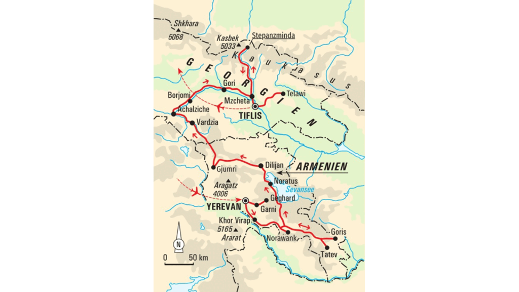 Wanderreise von der Ararat-Ebene bis zum Großen KaukasusDie weißen Berggipfel umzingeln die blühende Natur wie gigantische Wachposten. Turmfalken und Gänsegeier ziehen ihre Kreise, Gämse und Steinböcke grasen zufrieden an den Berghängen. Die Sonne erhebt sich langsam hinter den Hügeln, die Luft ist klar und frisch. Die Natur wirkt so friedlich, als wäre dieser Teil der Erde noch nicht von Menschen entdeckt. Dabei war diese Region seit jeher ein Durchgangsland der Völker. Zwischen Europa und Asien, zwischen Schwarzem und Kaspischem Meer, zwischen Islam und Christentum, zwischen Antike und Moderne – Armenien und Georgien waren schon früh im Mittelpunkt des Zeitgeschehens. Hier strandete die Arche Noah, hier suchten die Argonauten das Goldene Vlies und hierher brachte Prometheus das himmlische Feuer. Wir wandern am Fuße des Großen Kaukasus und behalten die Gipfel der Fünftausender stets im Blick. Wir entdecken die frühchristlichen Klöster Armeniens, die stolzen Wehrkirchen Georgiens und die hellenistischen Tempel Kaukasiens. Dabei lauschen wir den Geschichten der griechischen Mythologie am Kasbek, staunen über die Basaltformation "Symphonie der Steine" in der Azat-Schlucht, kosten Weintradition in Kachetien und lüften in Garni das Geheimnis der traditionellen Brote. Wir bewundern die architektonische Vielfalt in Tiflis, die Monumentalbauten von Jerewan und die beeindruckenden Karawansereien in beiden Ländern, die den Reisenden entlang der Seidenstraße Unterschlupf gewährten. Die beiden Länder gleichen einer Schatzkammer – und wir werfen gemeinsam einen Blick hinter die Türe.