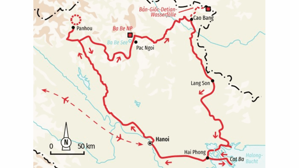 Trekkingreise durch die grüne Bergwelt im Nordosten VietnamsDichter Dschungel, sattgrünes Blätterdach und die Stille der Natur umgeben uns – doch es dringt noch ein anderes Geräusch zu uns durch, mit jedem Schritt hören wir es immer deutlicher, langsam lichtet sich der Wald und die Pflanzen geben den Blick frei auf rauschende Wassermassen die sich über mehrstufige Kaskaden ergießen: den beeindruckenden Bản-Giốc-Fällen. Umgeben von Reisfeldern und direkt an der chinesischen Grenze entdecken wir dieses abgelegene Juwel Vietnams. Neben der wuchernden Natur, den in steile Berghänge gebauten Reisterrassen und den tosenden Wasserfällen sind es vor allem die Menschen, die diese Region so besonders machen. Immer wieder tauchen wir tief ein in die Kultur und das Leben der verschiedenen Bergvölker. Wir sind zu Gast bei den Hmong und Dao, übernachten in traditionellen Stelzenhäusern und haben die Möglichkeit bei der Zubereitung der traditionellen Gerichte über die Schulter unserer Gastgeber zu blicken. Wir wandern im äußersten Nordosten des Landes bis zur chinesischen Grenze, trekken in der entlegenen Region Hoang Su Phi von Dorf zu Dorf und folgen schmalen Pfaden durch die Kalksteinlandschaft von Cao Bang. Mit dem Kajak erkunden wir die größte Insel der Halong-Bucht und per Boot gleiten wir über den mystischen Ba Ba See. Leuchtend grüner Bambuswald, goldgelbe Reisterrassen und farbenfrohe Trachten - mindestens genauso bunt und abwechslungsreich werden auch unsere Erinnerungen an diese Reise sein.