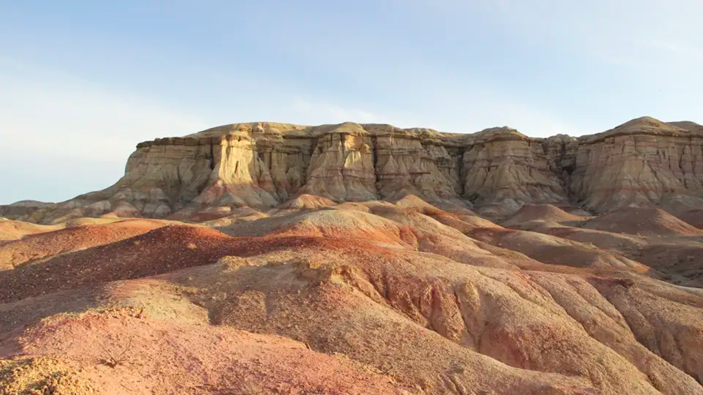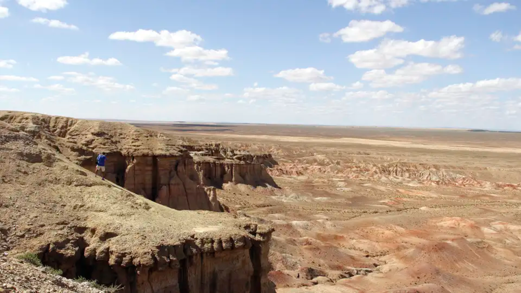 <Wir setzen unsere Fahrt in Richtung Süden nach Tsagaan Suvarga ("Weiße Stupa") fort. Auf einer Wanderung bewundern wir den beeindruckenden Canyon, die durch Wind und Regen geformten Klippen und die vielen unterschiedlichen Gesteinsschichten, die bezeugen, dass sich vor Millionen von Jahren an dieser Stelle ein Meer befand. -