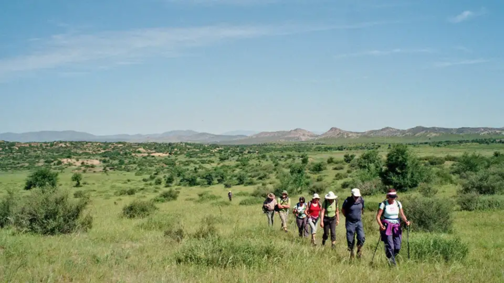 <Unser heutiges Ziel ist das Bergmassiv des Ikh Khairkhan. Der Berg ist für die einheimischen Nomaden heilig. Hier erleben wir eine einzigartige Landschaft – rund um den Berg finden sich beeindruckend schöne Felsformationen, Canyons mit steilen Klippen und langgezogenen Höhlen. Vom Berg aus bietet sich der Blick in die weite Steppe – ein Gefühl wie auf einem Schiff im Ozean. Wir wandern am Berg und durch ein enges Tal mit Aufstieg bis auf 2.040 m. Unterwegs machen wir ein Picknick. Unser Lager errichten wir auf ca. 1.780 m. -