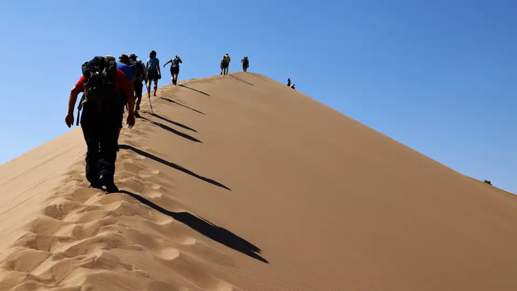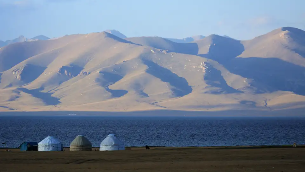 <Mit der Singenden Düne und den Aktau-Bergen stehen heute die Wahrzeichen des Altyn-Emel-Nationalparks auf dem Programm. Kurz bevor wir die Düne erreichen, stoppen wir in Myngbulak, übersetzt "Tausend Quellen". Eine Trinkwasserquelle tritt hier aus dem Boden und liefert Vegetation die Chance in der kargen Wüstenlandschaft zu überleben. Die 180 m hohe und über drei Kilometer lange Sanddüne schiebt sich dann ganz plötzlich in unser Blickfeld. Wir steigen hinauf und genießen die herrliche Aussicht auf den Fluss Ile, die umliegenden Berge und die Düne selbst. Wind aus Westen entlockt der Düne Ihren Gesang, aber auch unsere Schritte über ihren Kamm lösen das Phänomen aus. Nach einem Picknick fahren wir weiter in den östlichen Teil des Nationalparks zu den farbenprächtigen Aktau-Bergen. Weiße Sedimentschichten wechseln sich mit roten und gelben Streifen ab. Wir wandern entlang der beeindruckenden Felsformationen und malen uns aus, wie sich vor Millionen von Jahren hier ein Ozean erstreckte. Bevor wir nach Basshi zurückkehren, legen wir noch einen Stopp an einer 700-jährigen Weide ein. Die mächtigen Äste des Baums streben in alle Himmelsrichtungen und müssen aufgrund ihres Gewichts gestützt werden. -
