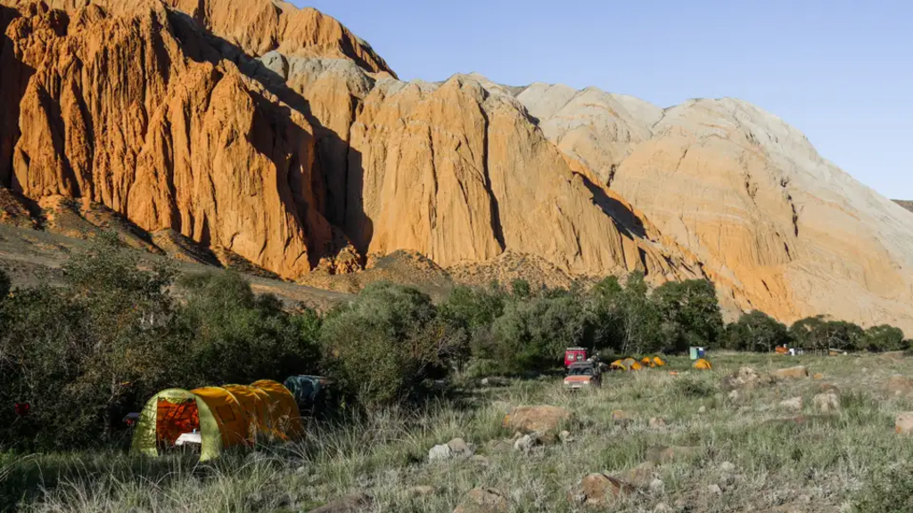 <Nach dem Frühstück beginnt unsere erste Bike-Etappe und führt uns die Straße entlang Richtung Karakolpass (3485 m). Die Karakolschlucht ist eine sehr schöne und malerische Region mit unterschiedlicher Flora. Wir fahren größtenteils auf Schotterwegen. Inmitten dieser markanten Landschaft werden wir bei einer Mittagsrast mit Kaffee, Tee, frischen Früchten und einer kleinen Mahlzeit versorgt. Am Ende unserer Etappe errichten wir unsere Zelte und genießen den Tagesausklang umrahmt von vier- bis fünftausend Meter hohen Gipfeln. -