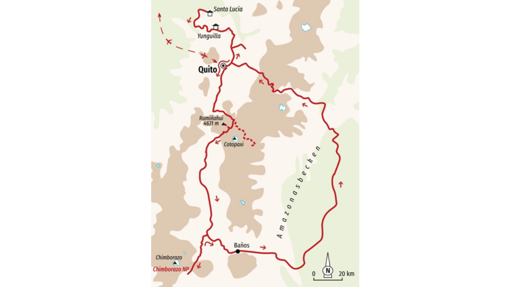 Lodge-Trekking entlang der "Avenida de los Volcanes" und in das Amazonas-GebietDie Straße der Vulkane, so nannte Alexander von Humboldt die andine Bergwelt Ecuadors. Dreißig teils noch aktive Vulkane reihen sich entlang der östlichen und westlichen Andenkette aneinander. Auf abgelegenen Wegen mit Blick auf den schneebedeckten, formschönen Cotopaxi wanden wir am Fuße des rauchenden Vulkans. Wenn wir nach oben in den Himmel blicken, sehen wir mit etwas Glück Kondore über unseren Köpfen kreisen. Die Wahrscheinlichkeit besteht, da wir uns im Gebiet der Könige der Anden befinden. Von der Whymper Hütte aus lassen wir unseren Blick über die Weite des Chimborazo Nationalparks schweifen und versetzten uns in eine Zeit zurück, als Alexander von Humboldt in derselben Region auf Erkundung war. Welchen Gipfel auf Humboldts Straße der Vulkane wir wohl besteigen werden? Szenenwechsel: Umgeben von üppig-grünem Urwald hören wir das Rauschen der Wasserfälle, kühlen uns im Fluss ab und wandern durch dieses komplexe Ökosystem mit einer Vielfalt an exotischen Pflanzen und Tieren. Beim Abendessen in unserer Lodge erzählen wir uns gegenseitig von den vielfältigen Eindrücken Ecuadors und lauschen den exotischen Geräuschen des Urwalds – ein Konzert für alle Sinne.