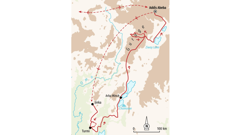 Trekkingreise durch das Omo-Tal und das Gebiet der GurageEine Reise in den Süden Äthiopiens ist wie eine Reise in eine andere Welt – wir erleben Landschaften von aufregender Schönheit und lernen für uns außergewöhnliche Lebensweisen kennen. Man könnte sagen, wir erleben das "echte", das "authentische" Afrika mit seinen Savannen, Schirmakazien und endloser Weite. Über grüne Hügel wandern wir in der Umgebung von Arba Minch und genießen die Aussicht auf den Lake Chamo. Hier räkeln sich riesige Krokodile auf den Sandbänken in der Sonne. Zu Fuß eine Gegend zu erkunden und in der Umgebung der Dörfer zu zelten, schafft eine ganz intensive Nähe mit der Bevölkerung. Das erleben wir sowohl im Omo Tal als auch im Gebiet der Gurage. Während beider Trekkingabschnitte übernachten wir in Zelten in der Nähe der Dörfer, kosten einheimische Kulinarik, bekommen Einblicke in die Traditionen und Lebensweisen unterschiedlicher Völker und lauschen deren Geschichten. Gestärkt mit einem typischen Frühstück starten wir in den nächsten Tag und lassen uns von den Besonderheiten der Region verzaubern. Eine Reise zu den Völkern des Süden Äthiopiens erfordert behutsames Auftreten und ist gleichzeitig der Schlüssel zu unvergesslichen Begegnungen.