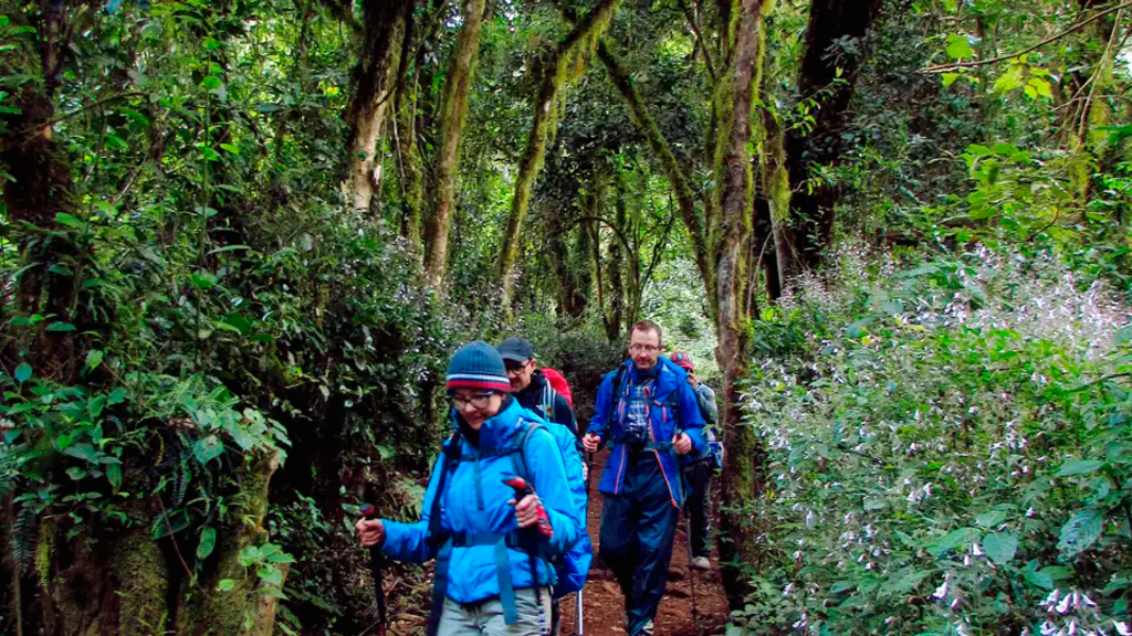 <Nach dem Frühstück fahren wir zum Marangu Gate (1.860 m). Hier treffen wir unsere Begleitmannschaft, stellen uns gegenseitig vor, erledigen die Nationalpark-Registrierung und machen uns auf den Weg. Die erste Etappe führt circa vier Stunden durch den dicht bewachsenen Regenwald. Es kann zu Regenfällen kommen – ganz typisch für diese Region und den tropischen Regenwald. Das Blätterdach ist dicht und grün, Flechten hängen von den Bäumen herab, die Pflanzen wachsen hier viel größer, als wir es aus Europa kennen. Der Weg steigt leicht an. Vielleicht sehen wir Stummelaffen in den Baumwipfeln hin und her springen. Auf einer Lichtung liegen die Mandara-Hütten (2.720 m), unser Tagesziel. Wer möchte, kann am Nachmittag noch einen Ausflug zum nahe gelegenen Maundi-Krater machen. -