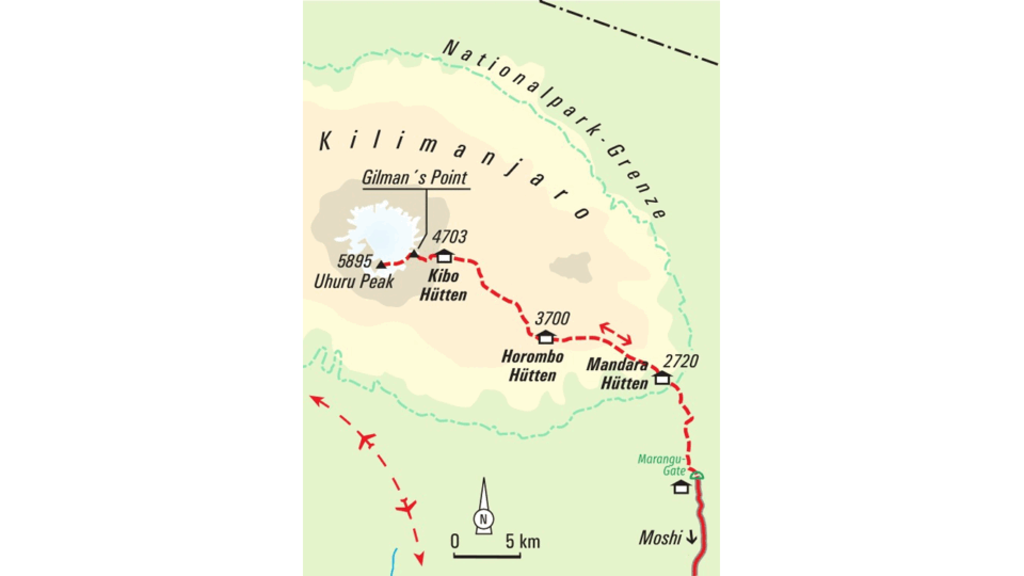 Für die im Durchschnitt fünf- bis siebenstündigen Tagesetappen bei der Besteigung des Kilimanjaro ist nicht so sehr bergsteigerisches Können erforderlich, vielmehr sehr gute Kondition und körperliche Fitness. Am Gipfeltag beträgt die reine Gehzeit über zwölf Stunden, wobei 1.180 hm im Auf- und knapp 2.200 hm im Abstieg bewältigt werden müssen! Die ungewohnte Höhe stellt zusätzliche Anforderungen an den Körper, die nicht zu unterschätzen sind. Herz und Kreislauf müssen gesund sein. Es ist ratsam vor Reiseantritt einen Arzt zu konsultieren. Langsames und stetiges Gehen während des Aufstiegs von Beginn an ist für die Höhenanpassung unabdingbar. Zu rasches Gehen kann zu Höhenkrankheit und damit zum Abbruch der Tour führen. Wir empfehlen, sich durch Ausdauersport (Joggen, Radfahren, Walken oder Schwimmen) und ausgedehnte Wanderungen und Bergbesteigungen auf diese Reise vorzubereiten. Vor allem der letzte Aufstieg zum Krater des Kibo ist aufgrund der Höhe sehr anstrengend und erfordert neben Trittsicherheit viel Ausdauer. Schier endlos geht es sehr steil über loses Lava-Geröll hinauf zum höchsten Punkt Afrikas. Meist verläuft die Marangu-Route auf breiten Pfaden.
