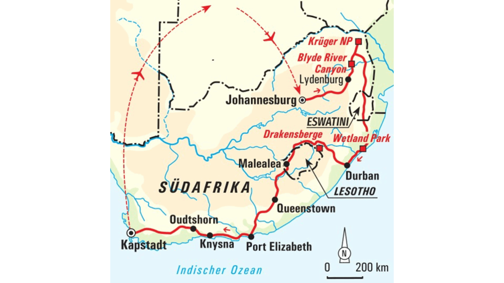 Wander- und Safarireise von Johannesburg über Eswatini, Lesotho und die Garden Route nach KapstadtEine sanfte Brise mit dem Duft von Akazien und Jacaranda-Bäumen streift unsere Haut, ein leichtes Kribbeln entsteht im Bauch. Wir fahren im offenen Geländewagen durch die weite Steppe des Krüger-Nationalparks und sind Afrikas wilden Tieren dicht auf der Spur: Löwen, Giraffen, Zebra- und Gnuherden. Neben uns raschelt im Gebüsch eine Warzenschweinfamilie, in der Ferne trampelt eine Elefantenherde am Fluss entlang. Zu Wasser erleben wir bei St. Lucia eine Safari der anderen Art: unser Bootsausflug führt uns zu Krokodilen und Flusspferden. Richtig aufregend wird es zu Fuß, den Nashörnern ganz nah im Hlane Nationalpark in Swasiland. An der Panoramaroute blicken wir wandernd auf hohe Wasserfälle, hinein in tiefe Canyons und weit über die tiefgrüne Landschaft hinweg. In den Drakensbergen schauen wir auf die hohen Gipfel des Amphitheaters und entdecken immer wieder traditionelle Rundhütten der Zulus in den Dörfern. Bei unseren ausgiebigen Wanderungen im Königreich Lesotho können wir den lokalen Basotho, eingehüllt in bunte Decken auf ihren Pferden, begegnen. Die wilde, zerklüftete Küstenlandschaft erkunden wir im Tsitsikamma Nationalpark auf dem Ottertrail. Genussvoll wird es in den "Winelands", wo wir die berühmten Weine Südafrikas und lokale Gaumenfreuden auf einem kleinen Weingut genießen. Hoch spritzt die Gischt vor uns auf, wenn wir zum Kap der Guten Hoffnung wandern. Wir runden unser Kapstadt-Erlebnis mit einer Wanderung auf den Tafelberg ab – hier liegt uns das Kap zu Füßen.