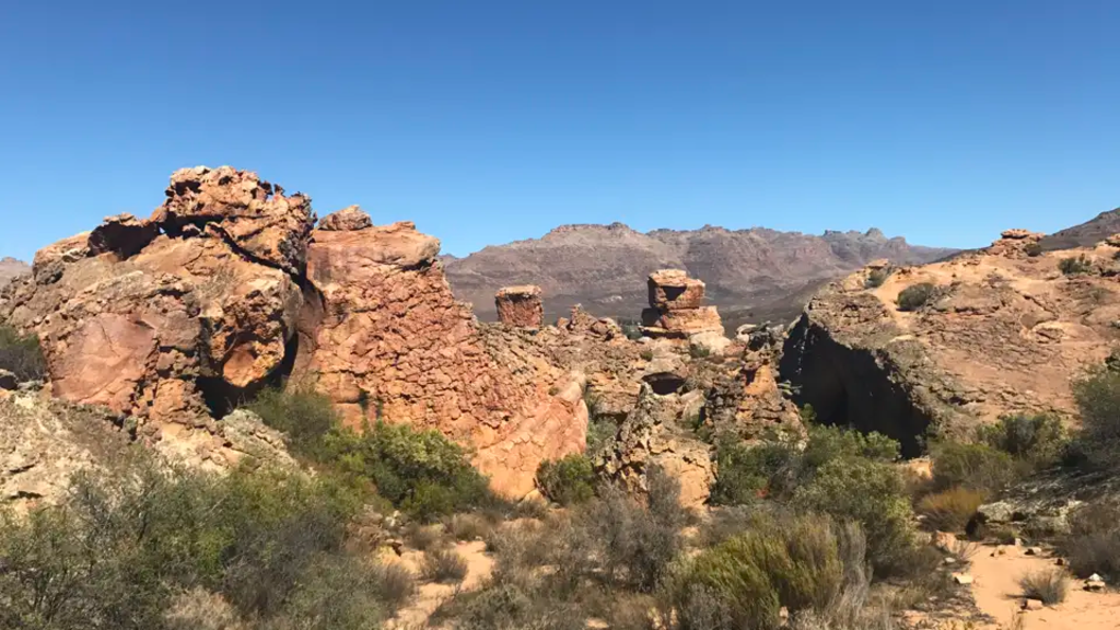 <Wir verlassen Kapstadt und fahren and der Westküste durch Farmland gen Norden . Wir erreichen die Cederberge, ein bekanntes Wander- und Klettergebiet. Die Landschaft ist geprägt von Steinbögen, Felsformationen und Felsmalereien. Wir bauen unser Camp erstmalig auf, essen zu Mittag und richten uns ein. Am Nachmittag wandern wir zum "Maltese Cross", einem Malterser Kreuz aus Stein. -
