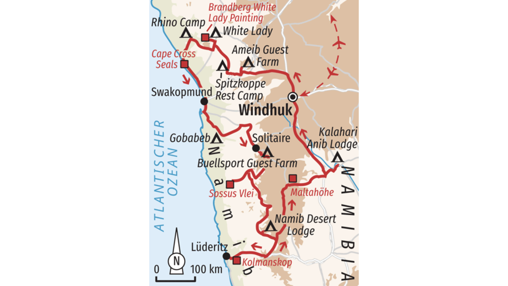 Wanderreise mit naturnahem Camping durch ganz Namibia mit unserem "Wüstenfuchs"Die Namib ist eine der ältesten und trockensten Wüsten der Welt. Entdecken Sie die unglaubliche Vielfalt der einzigen afrikanischen Küstenwüste, die sich bei einer Breite von 100 - 150 km über 2000 km vom Oranje River Südafrikas bis hinauf nach Angola erstreckt. Hier endlose Sandmeere mit einigen der höchsten Dünen der Welt, mal weiß, gelb oder in leuchtendem Apricot, dort Mondlandschaften aus riesigen Geröll- und Kiesflächen oder wild zerklüftete, bunt gefärbte Bergwelten aus Sandstein, Granit und Lava, durchzogen von tiefen Canyons und Trockentälern. Einsam und fast menschenleer zieht sie sich am eiskalten Atlantik entlang und ist doch voller Leben. Die Bandbreite reicht von nebeltrinkenden Schwarzkäfern, lebenden Fossilien wie den Welwitschia-Pflanzen bis hin zu Hunderttausenden von Pelzrobben, von Spitzmaulnashörnern über Giraffen und Löwen bis hin zu den Phantomen der Wüste, den legendären Wüstenelefanten. Sie alle sind Teil der Namib Wüste und Bestandteil dieser neu erkundeten Sondertour "Zeit für die Namib", die unser Wüstenfuchs Egmont Strigl für Sie auf neuer Route zusammengestellt hat. Kommen Sie mit und staunen Sie selbst...