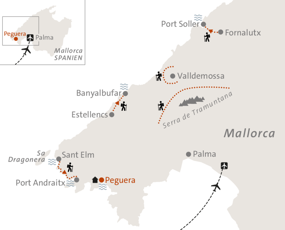 Mallorca gilt als eine der schönsten Inseln des Mittelmeeres. Sanft geschwungene Hügel, weite Schafweiden und leuchtende Mandelplantagen prägen das Bild des Inselinneren. Bewaldete Bergrücken gehen über in die imposante Bergkette der Sierra de Tramuntana, deren Gipfel schroff in den Himmel ragen. Zwischen Olivenhainen und Trockensteinmauern verbergen sich kleine Dörfer, in denen die Zeit stehen geblieben scheint. Erhaben thronen Burgen und Klöster auf den Höhen, während sich malerische Häfen und ruhige Buchten harmonisch an die Küste schmiegen. Das klare Licht, der Duft von Rosmarin und Pinien und das Spiel der Farben zwischen Meer und Gebirge verleihen der Insel ihren unverwechselbaren Zauber. Auf uns wartet eine Woche voller Leichtigkeit, Sonne und Bewegung.