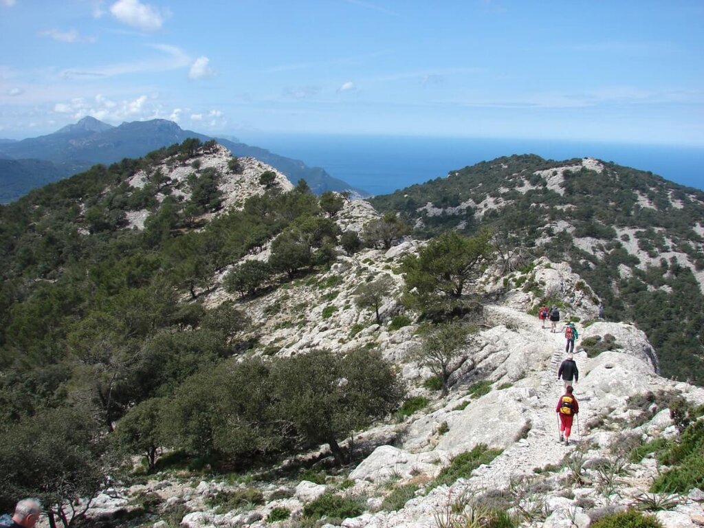 <Vom Stausee Gorg Blau wandern wir über einen Sattel hinab zur Quelle d'es Prat. Hier führt uns ein schmaler Steig durch einen Steineichenwald sanft bergan, bis wir eines jener stillen Täler erreichen, in denen man noch die Ursprünglichkeit der Insel atmen kann. Über Wiesen, immer bergan, erreichen wir die steile Gipfelwand der Massanella. Wir umwandern die Wand, bis wir zum höchsten begehbaren Punkt Mallorcas (1.352 m) gelangen. Bei der Gipfelrast genießen wir die Höhenluft Mallorcas. Der Abstieg erfolgt über die Finca Comafreda zum Coll de sa Bataia. -