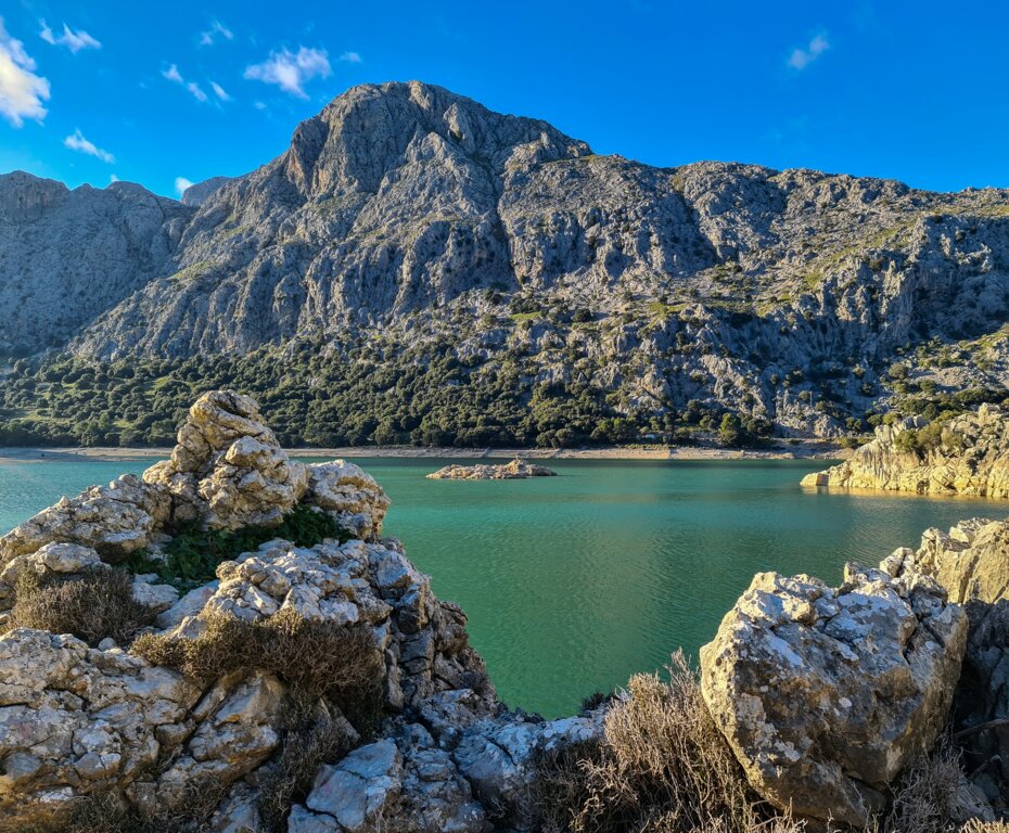 <Im Herzen der Serra de Tramuntana liegen malerisch die Stauseen Gorg Blau und Cuber. Hier starten wir zu der wohl schönsten Panoramawanderung Mallorcas. Über den alten Schneesammlerpfad erreichen wir bald unseren ersten von drei Gipfeln, die über 1.000 Meter Seehöhe liegen. Wir genießen den Ausblick über ganz Mallorca, bei gutem Wetter sehen wir sogar bis Menorca. Nun beginnt unser teils wegloser Pfad: ohne viel an Höhe zu verlieren wandern wir von Gipfel zu Gipfel.