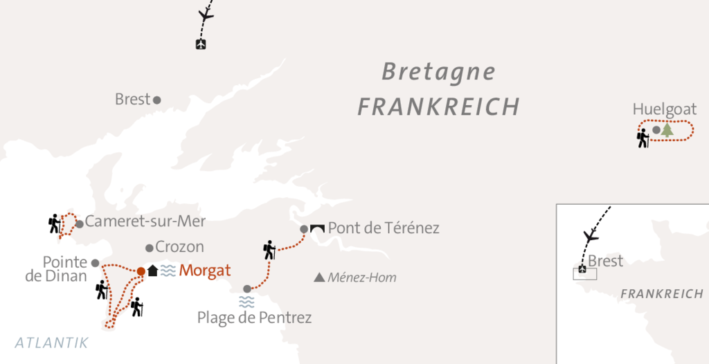 Wo das Meer in kräftigem Blau an schroffe Klippen schlägt und feine Sandstrände in einsame Buchten einladen, liegt die Crozon-Halbinsel – ein Stück Bretagne, das mit Ursprünglichkeit und Vielfalt verzaubert. Auf unseren Wanderungen folgen wir dem legendären Zöllnerpfad (GR34), der uns von bizarren Felsformationen zu goldenen Stränden, von geheimnisvollen Wäldern bis hinauf zum Gipfel des Menez-Hom führt. Unterwegs lassen wir uns den salzigen Atlantikwind ins Gesicht wehen, durchstreifen geschichtsträchtige Orte wie Locronan und staunen über die moosbewachsenen Felsblöcke im sagenumwobenen Huelgoat-Wald. Zwischen wilden Küstenlandschaften und kulinarischen Entdeckungen spüren wir das französische savoir vivre – die Kunst, das Leben mit allen Sinnen zu genießen.