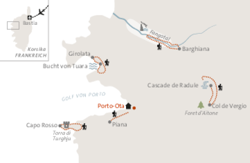 <Der Tag beginnt mit einem steilen Abstieg, bevor der Weg sanfter wird und wir durch die aromatisch duftende Macchia wandern. Bald erreichen wir Girolata, ein abgelegenes Fischerdorf in einer geschützten Bucht, das nur zu Fuß oder per Boot zugänglich ist und mit seiner ruhigen Lage sofort verzaubert. Nach einer Pause im Ort folgen wir dem alten Postbotenweg, der uns mit weiten Blicken entlang der Küste begleitet. In der Bucht von Tuara lädt das klare Meer zu einem erfrischenden Bad ein – ein wunderbarer Moment der Entspannung.