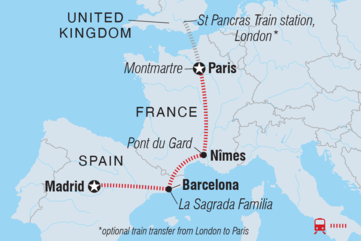 Mit dieser achttägigen Bahnreise von Paris nach Madrid entdeckst du einige der europäischen Highlights in Spanien und Frankreich, ohne dich durch Warteschlangen am Flughafen oder lange Fahrten zu quälen. Du fährst nur mit öffentlichen Verkehrsmitteln und bekommst einen einzigartigen Einblick in Paris, Nimes, Barcelona und Madrid, begleitet von einem örtlichen Reiseleiter, der die besten versteckten Orte kennt. Du wirst Croissants, Tapas und Churros probieren, durch versteckte Gänge wandern, um die besten Panoramablicke zu genießen, die nur die Einheimischen zu sehen bekommen, und die interessante Vergangenheit des menschlichen Schaffens mit Stopps an beliebten Wahrzeichen wie der Sagrada Familia und der Puerta del Sol erleben. Verlängere deine Reise und beginne in Großbritannien mit dem optionalen Eurostar-Transfer von London nach Paris (er dauert nur 2,5 Stunden!).