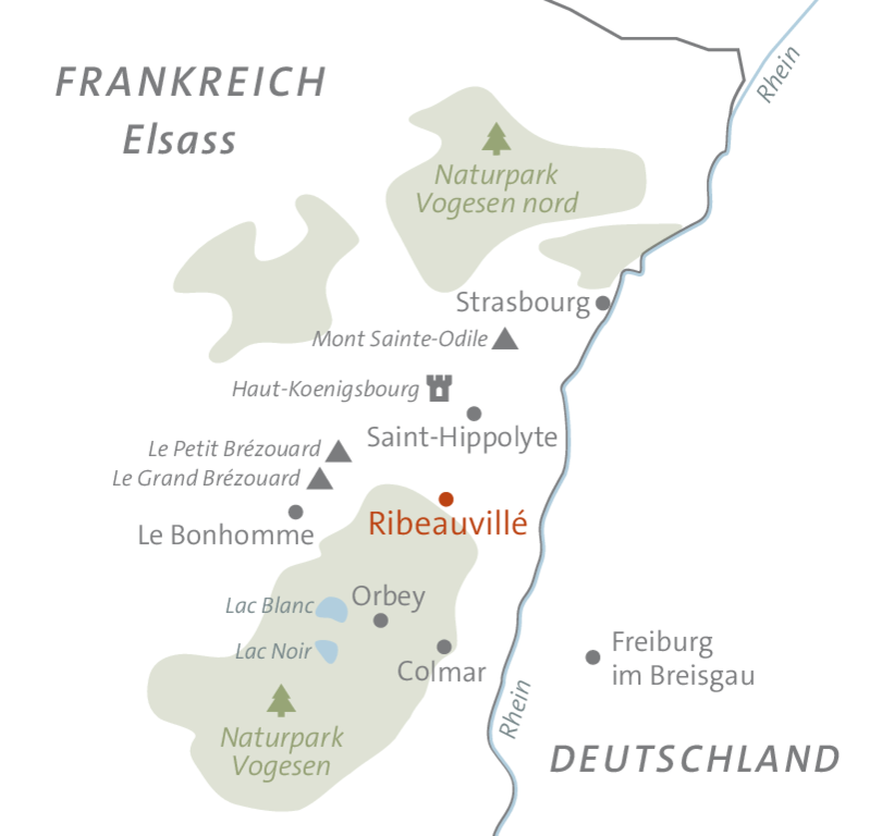 Mitten im Herzen des Elsass, direkt an der Weinstraße, liegt das Städtchen Ribeauville, überragt von drei aus dem 14. Jahrhundert stammenden verfallenen Schlössern. Mit einem historisch reichen und gut bewahrten Erbe ist dieses hübsche Örtchen sehr mit seiner Geschichte und seinen Traditionen verbunden. In unserem Hotel le Menestrel wird es uns an nichts fehlen. Dank seiner geographischen Lage wird uns das Hotel gleichzeitig ein Gefühl der Ruhe und des Rückzugs vom Alltag geben. Wir genießen den wundervollen Ausblick nach Norden auf die Schlöser von Ribeauville und nach Süden auf die Weinberge. Das Ziel unserer Gastgeber ist es, uns mit aller Bescheidenheit den Service eines großen Hotels zu bieten. Unsere Abendessen werden wir in zwei authentischen Lokalen in Ribeauvillè genießen, wo uns die elsässische Küche jedes mal aufs Neue in Erstaunen versetzen wird.